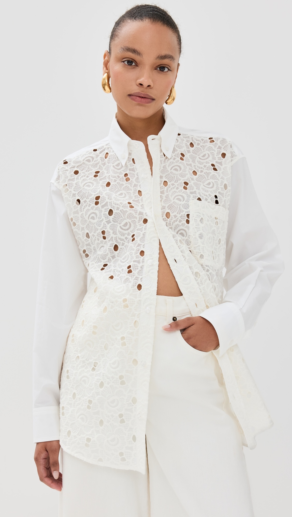 - Fabric: Lightweight, non-stretch lace - Collared neck - Long sleeves with button cuffs - Patch breast pocket - Shell: 100% cotton - Dry clean - Made in Italy Style #LADOU30888