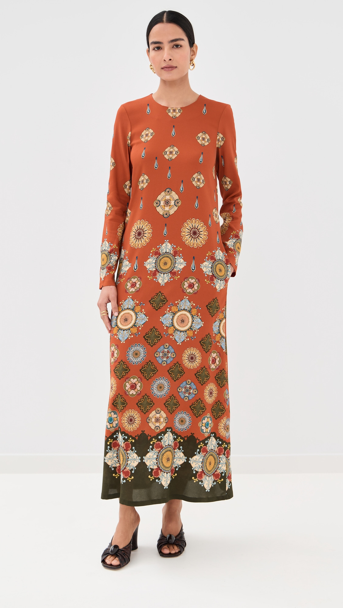 - Fabric: Lightweight stretch crepe - Abstract pattern - Maxi length - Crew neck - Long sleeves - Hidden zip at back - On-seam side pockets - Shell: 96% viscose/4% elastane - Unlined - Dry clean - Made in Italy Style #LADOU31117 Size & Fit Model measurements: Size XS: Priyanka (5'9") usually wears size XS Measurements from size S Length: 52.25in / 133.0cm, from shoulder