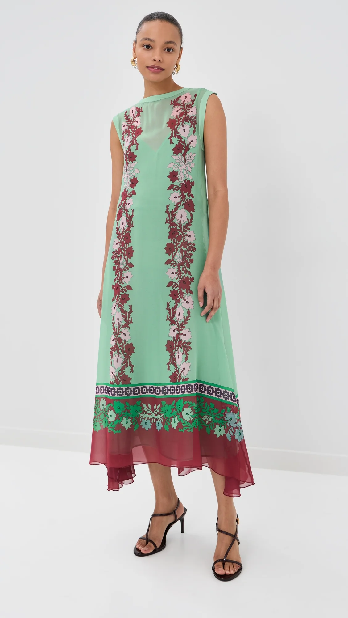 - Fabric: Lightweight, low-stretch silk chiffon - Floral print - Midi length - Crew neck - Sleeveless - Buttons and hook-and-eye closures at back - Shell: 100% silk - Optional slip lining - Dry clean - Made in Italy Style #LADOU31163 Size & Fit Model measurements: Size XS: Alexis (5'8") usually wears size XS-S Measurements from size XS Length: 50.5in / 128.0cm, from shoulder to front hem