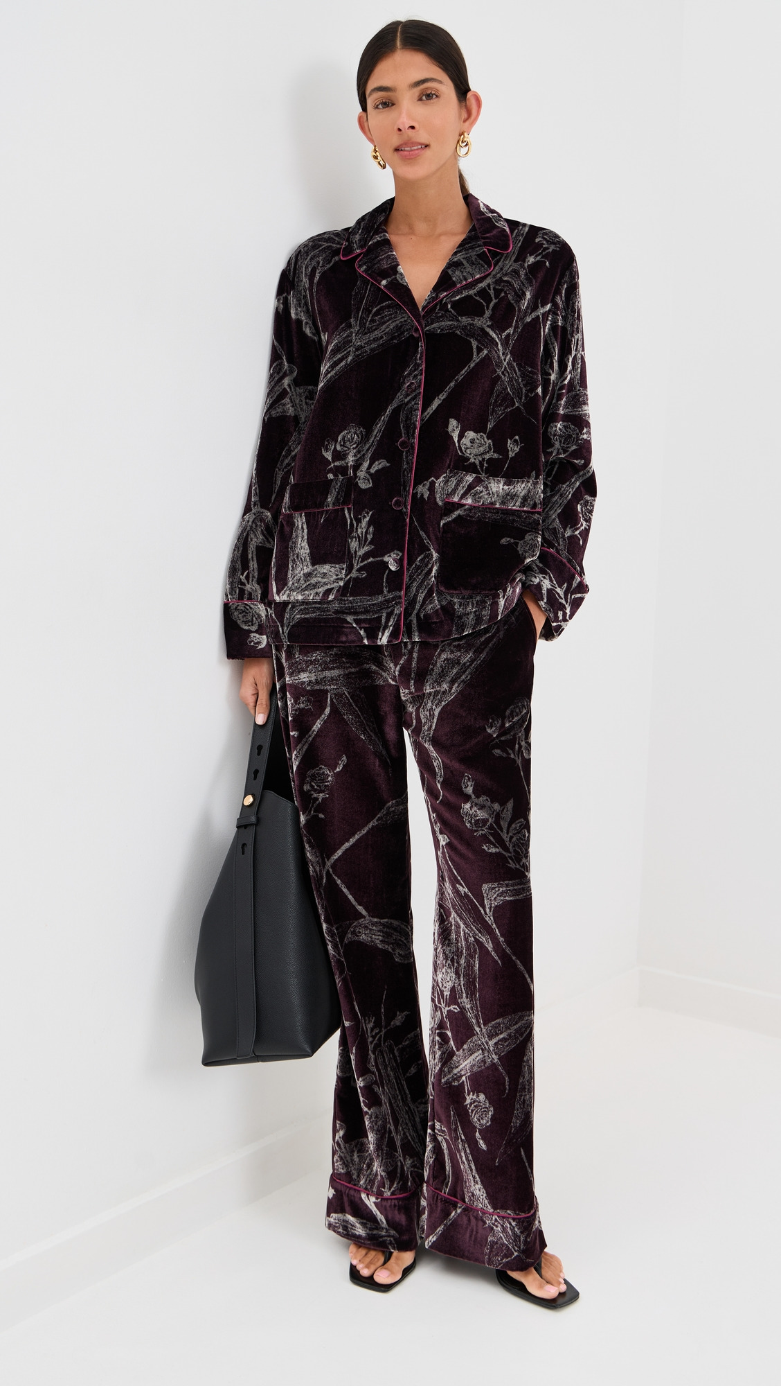 - Fabric: Lightweight, non-stretch devore pile weave - Floral print - Contrast satin trim - Velvet finish - Faux fly - Covered elastic waistband - On-seam side pockets - Shell: 80% viscose/20% polyamide - Dry clean - Made in Italy Style #LADOU31129 Size & Fit Model measurements: Size XS: Brittany (5'9.5") usually wears size XS Measurements from size S Rise: 11in / 28cm Inseam: 31.5in / 80cm Leg opening: 22.75in / 58cm
