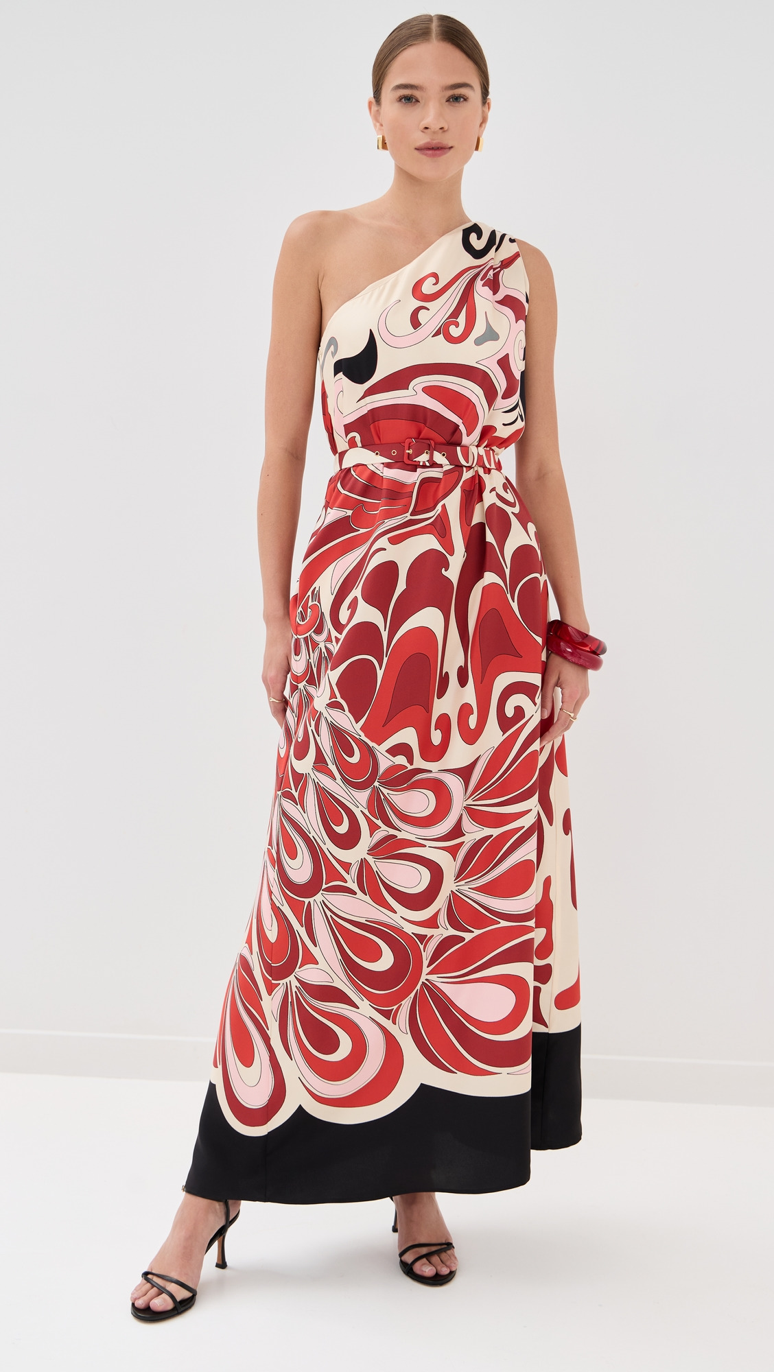 - Fabric: Lightweight, non-stretch silk twill - Abstract pheonix print - Ruched shoulder - Ruched elastic self-belt included - Maxi length - One-shoulder neckline - Sleeveless - Hidden zip at side - On-seam side pockets - Shell: 100% silk - Lined bodice, unlined skirt - Dry clean - Made in Italy Style #LADOU31078
