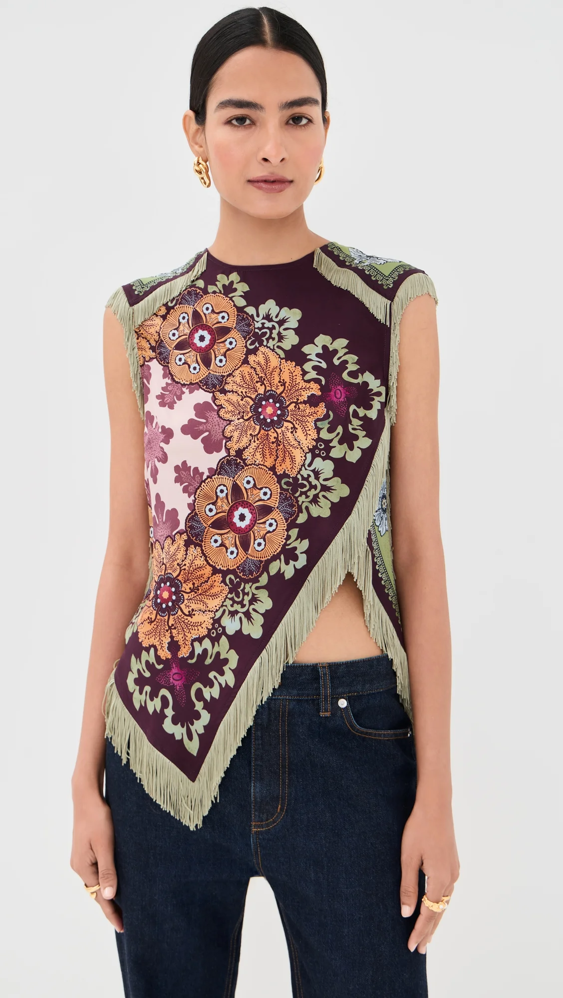 - Fabric: Lightweight, non-stretch silk crepe - Floral print - Fringe trim - Crew neck - Sleeveless - Shell: 100% silk - Unlined - Dry clean - Made in Italy Style #LADOU31126