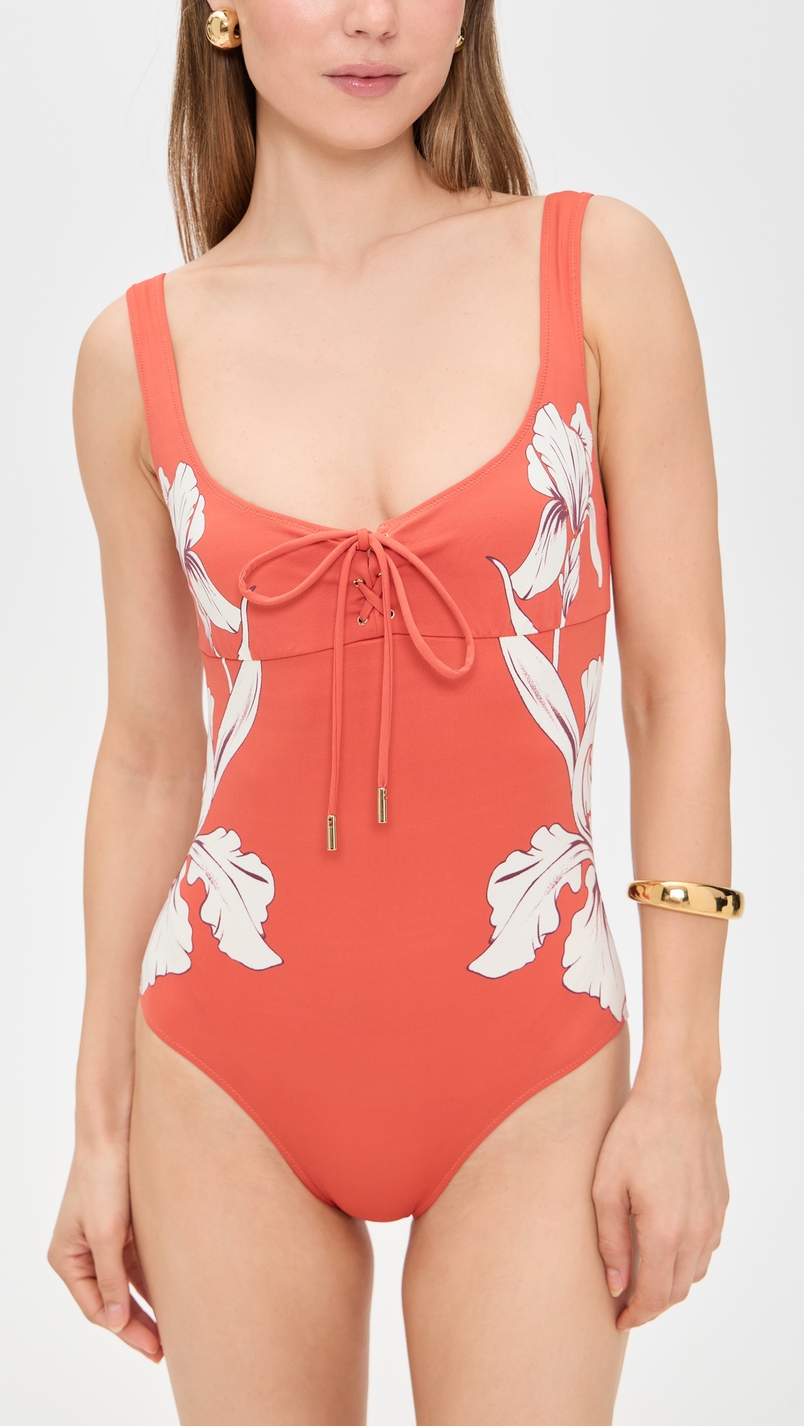 - Tie closure at scoop neckline - Floral print - Moderate coverage - Shell: 74% polyamide/26% elastane - Lined - Wash cold - Made in Italy Style #LADOU31015 Size & Fit Model measurements: Size S: Gabriela (5'9") usually wears size XS-S