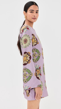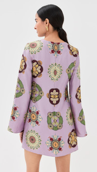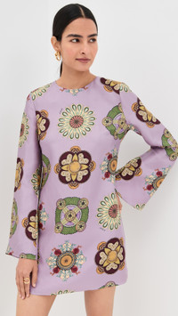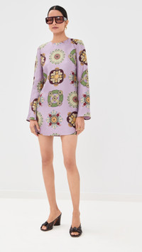 - Fabric: Lightweight, non-stretch silk twill - Floral print - Mini length - Crew neck - Long bell sleeves - Hidden zip at back - Shell: 100% silk - Unlined - Dry clean - Made in Italy Style #LADOU31139