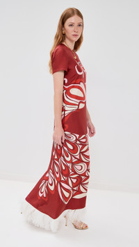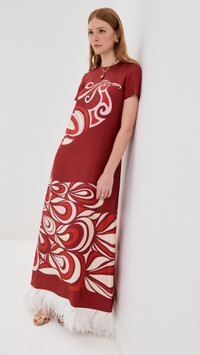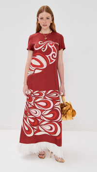 - Fabric: Lightweight, non-stretch silk twill - Ostrich feather trim at hem - Maxi length - Crew neck - Short sleeves - Hook-and-eye and hidden zip at back - On-seam side pockets - Shell: 100% silk - Unlined - Dry clean - Made in Italy Style #LADOU31090 Size & Fit Customers say: Runs large; please size down. Model measurements: Size S: Haley (5'9.5") usually wears size S Measurements from size XS Length: 54.25in / 138.0cm, from shoulder to front hem