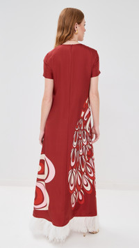 - Fabric: Lightweight, non-stretch silk twill - Ostritch feather trim at hem - Maxi length - Crew neck - Short sleeves - Hook-and-eye and hidden zip at back - On-seam side pockets - Shell: 100% silk - Unlined - Dry clean - Made in Italy Style #LADOU31090