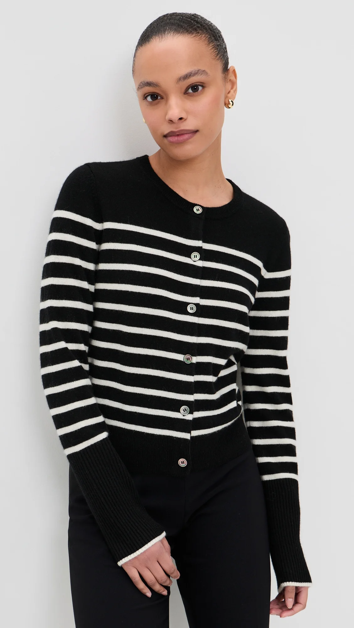 - Fabric: Lightweight brushed knit with stretch - Stripe pattern - Ribbed trim - Crew neck - Long sleeves - Button placket - Shell: 100% cashmere - Hand wash or dry clean - Imported, China Style #LALIG30322 Size & Fit Model measurements: Size S: Alexis (5'8") usually wears size XS-S Measurements from size S Length: 20.75in / 53.0cm, from shoulder