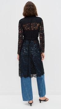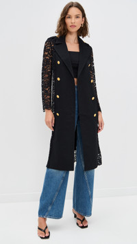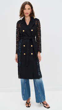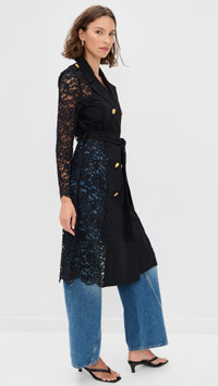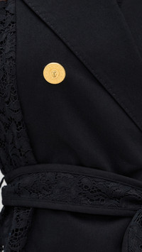 - Fabric: Mid-weight, non-stretch floral lace - Notched lapels - Embossed gold-tone buttons - Twill trim - Collared neck - Long sleeves - Double-breasted button placket - Optional self-belt at waist - Shell: 100% cotton - Trim: 59% cotton/41% nylon - Unlined - Dry clean - Imported, China Style #LGENC32290