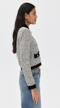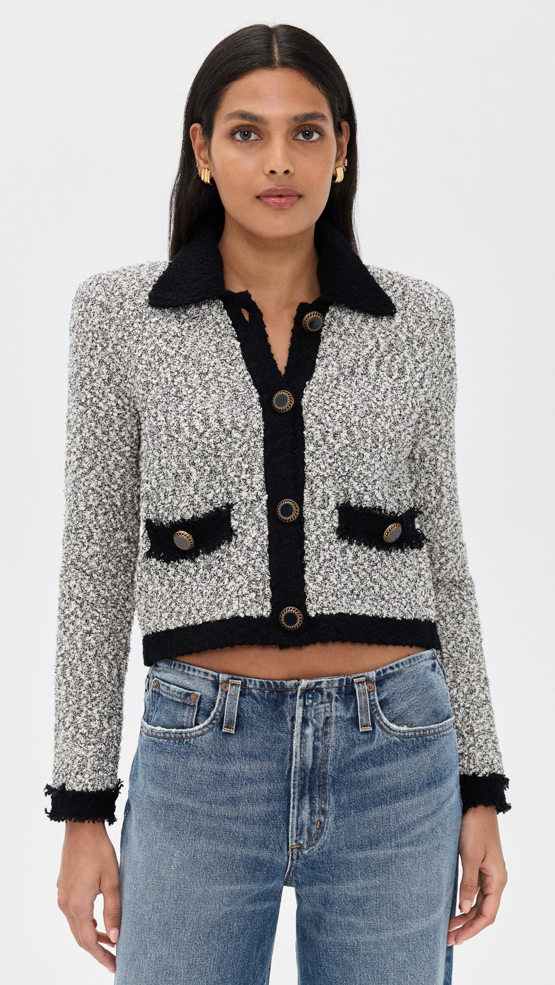 - Fabric: Mid-weight boucle knit with stretch - Contrast trim - Padded shoulders - Raw-edge details - Collared neck - Long sleeves - Button placket - Patch front pockets - Shell: 72% cotton/14% nylon/12% polyester/2% spandex - Unlined - Hand wash - Imported, Brazil Style #LGENC32239