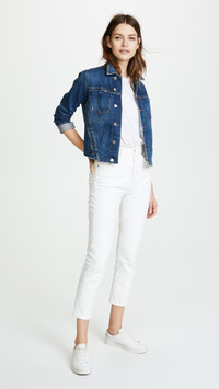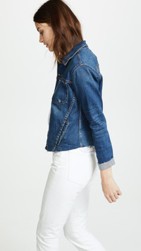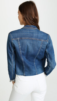 - Fabric: Mid-weight, stretch denim - Raw trim - Contrast stitching - Cropped profile - Collared neck and button placket - Long sleeves - Patch breast pockets and slant front pockets - Shell: 94% cotton/5% polyester/1% spandex - Lined - Lining: 65% polyester/35% cotton - Wash cold - Made in the USA of imported materials Style #LGENC30748 Size & Fit Measurements from size S Length: 20.5in / 52.0cm, from shoulder