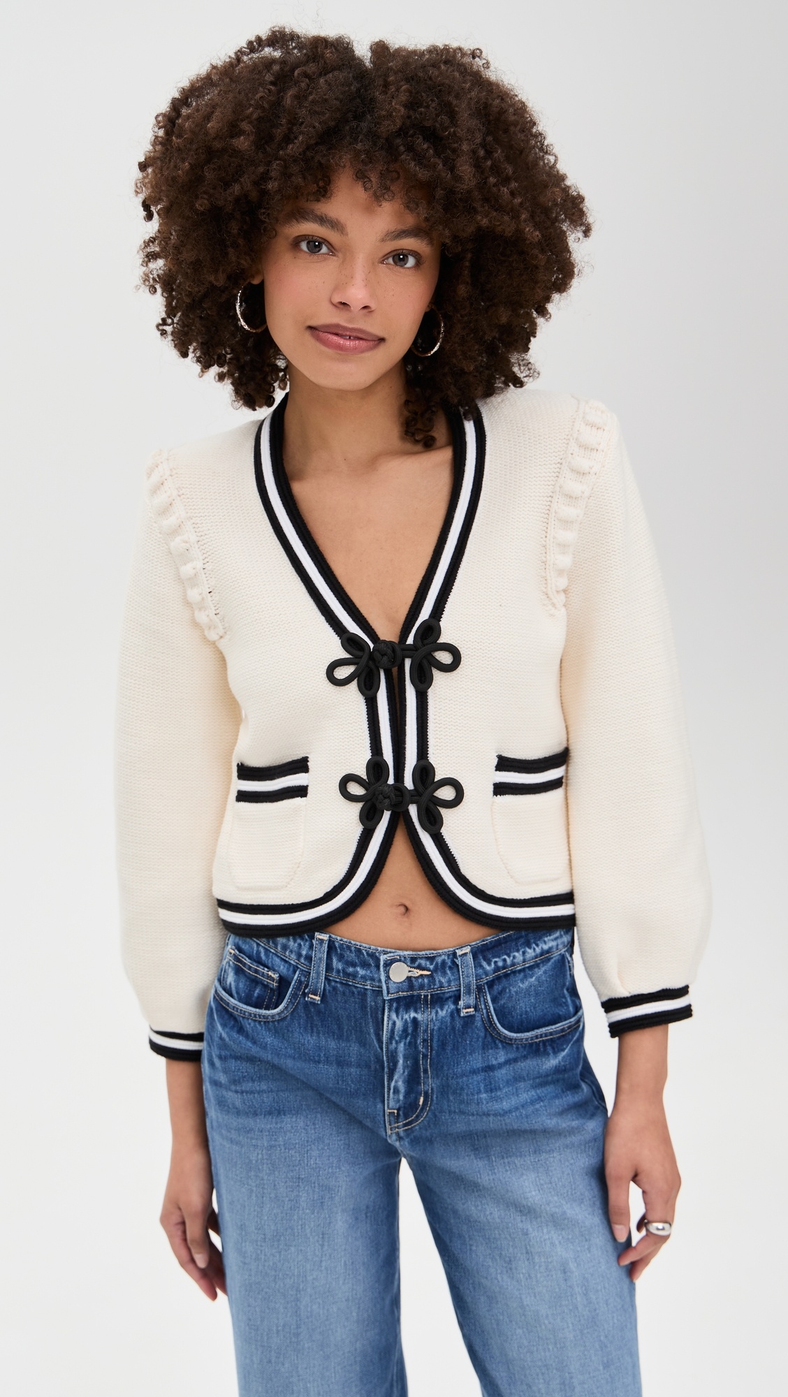 - Fabric: Mid-weight knit - Striped trim - Button-and-loop closures at front - V neck - 3/4 sleeves - Patch front pockets - Shell: 67% cotton/26% nylon/7% acrylic - Dry clean - Imported, China Style #LGENC32131