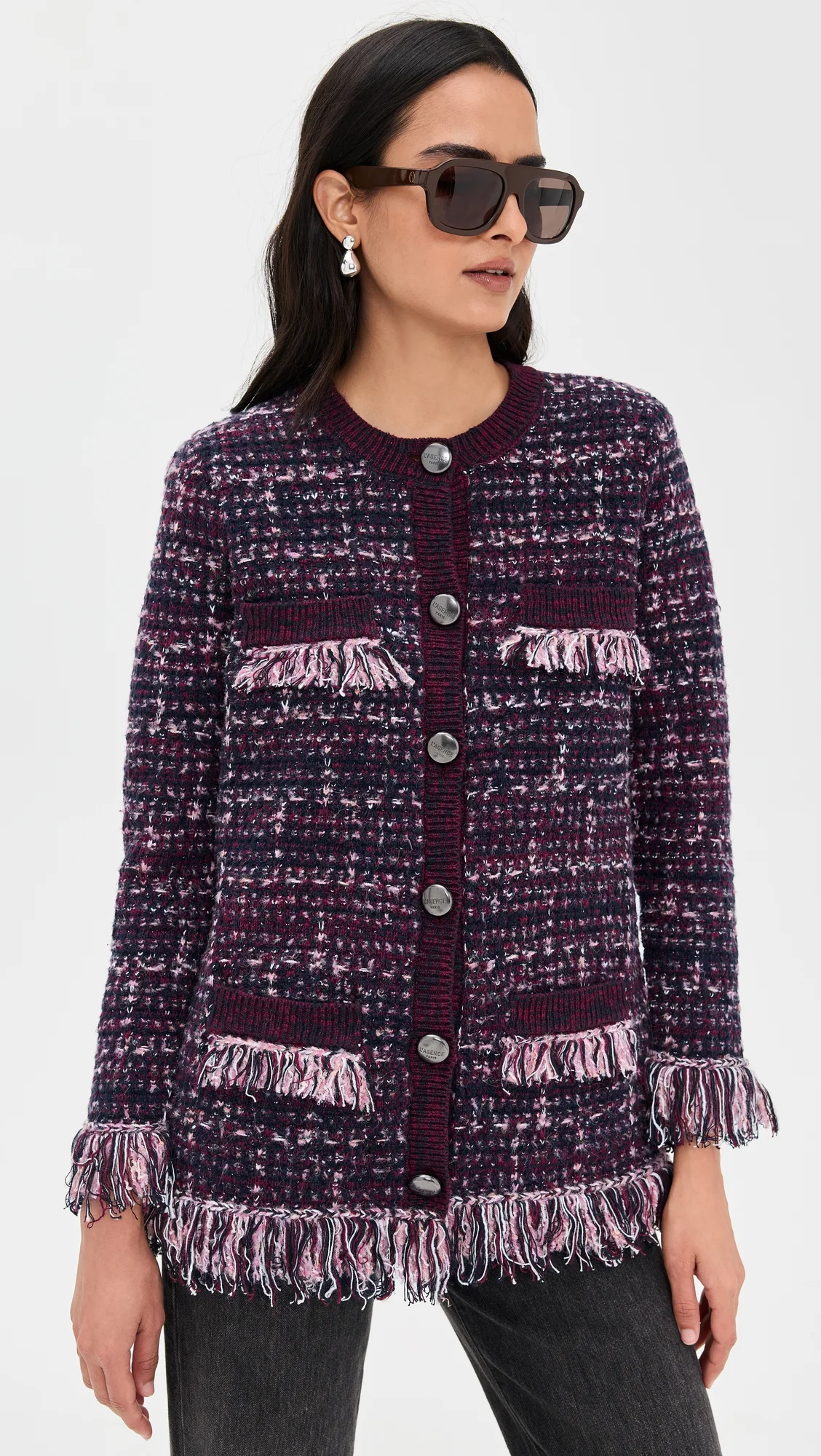- Fabric: Mid-weight knit - Padded shoulders - Fringe trim - Crew neck - Long sleeves - Button placket - Patch front pockets - Shell: 92% cotton/4% polyester/2% acrylic/1% nylon/1% wool - Dry clean - Imported, China Style #LGENC32335