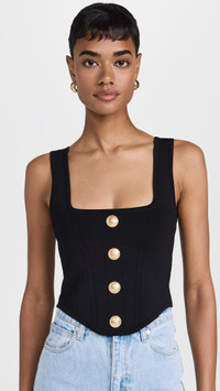 - Fabric: Lightweight compact knit - Decorative gold-tone buttons - Curved hem - Square neckline - Shell: 60% rayon/38% nylon/2% spandex - Dry clean - Imported, China - Sleeveless Style #LGENC31886 Size & Fit Model measurements: - Size XS: Ariana (5'9") usually wears size XS - Size L: Natasha (5'9") usually wears size M-L Measurements from size XS Length: 17.25in / 44.0cm, from shoulder