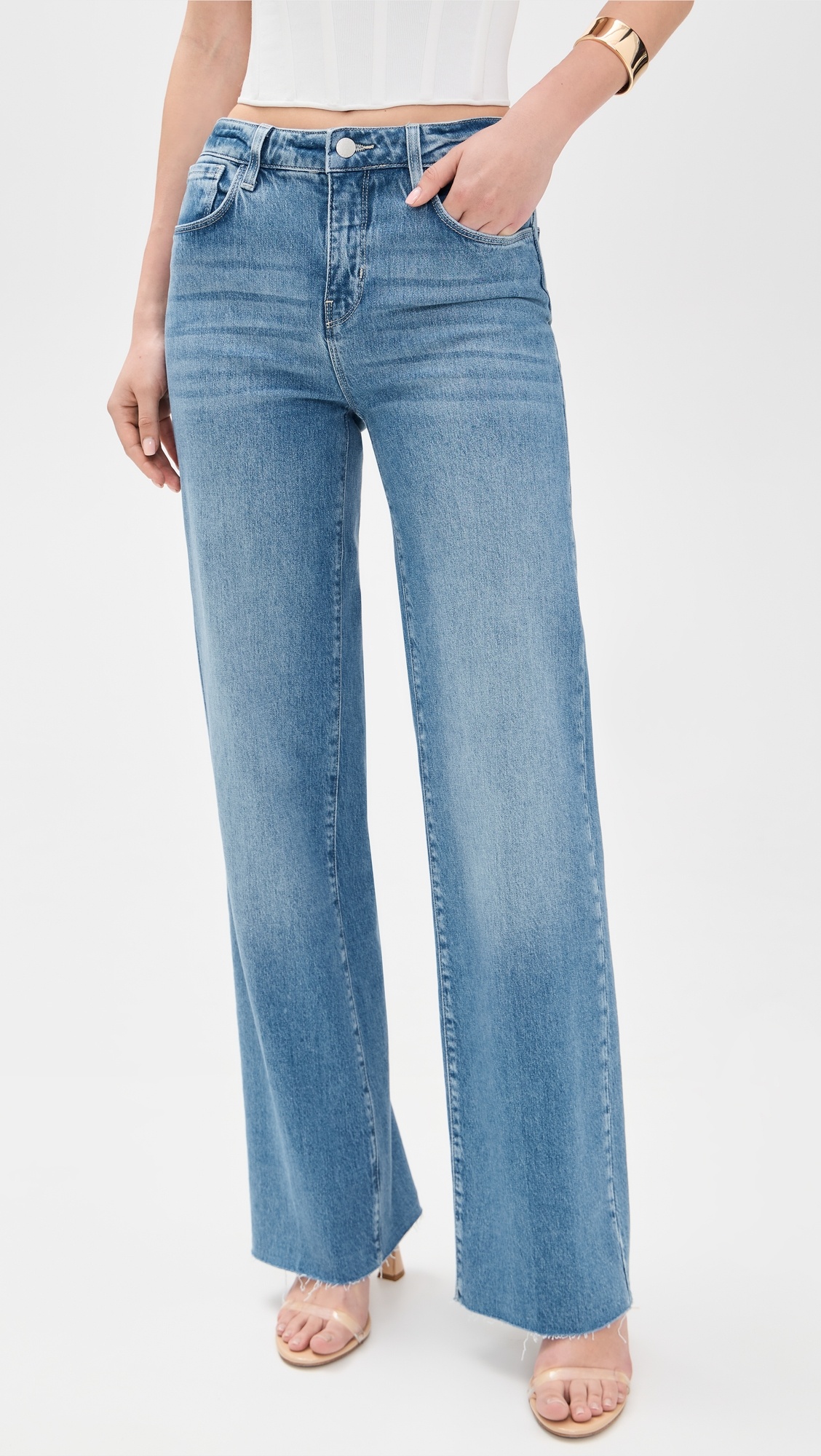 - Fabric: Mid-weight stretch denim - Fading and whiskering - Raw hem - Full length - Button closure and zip fly - 5-pocket styling - Shell: 73% cotton/26% lyocell/1% elastane - Wash cold - Made in the USA Style #LGENC32146 Size & Fit Features a high rise and a wide straight leg. Stretch denim has a brushed feel. Shopbop’s expert stylist says: Runs true to size Model measurements: Size 26: Alina (5'10") usually wears size 26 Measurements from size 25 Rise: 10.25in / 26cm Inseam: 31.5in / 80cm Leg opening: 19in / 48cm