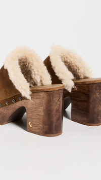 - Natural lamb shearling, from Brazil - Upper: Calfskin - Wooden heel and platform - Lining: Shearling - Block heel - Slip on - Round toe - Rubber sole - Imported, Brazil - This item cannot be gift-boxed Style #LARRO30306 Size & Fit Heel: 3.5in / 90mm Platform: 1.25in / 30mm