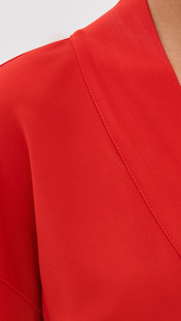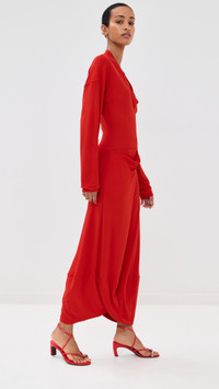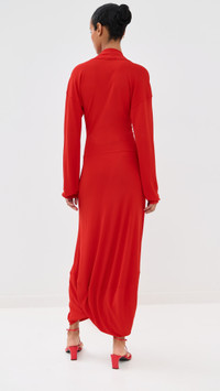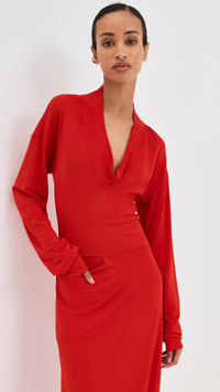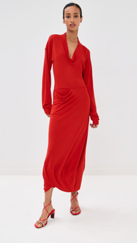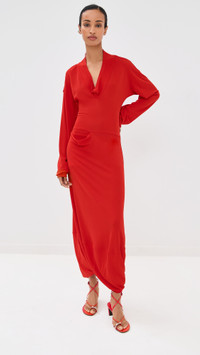 - Fabric: Mid-weight crepe jersey with stretch - Asymmetrical draped hem - Maxi length - V neck - Long sleeves - No closure, pull-on design - Patch front pocket - Shell: 100% viscose - Unlined - Dry clean - Made in Portugal Style #LEMAI30420