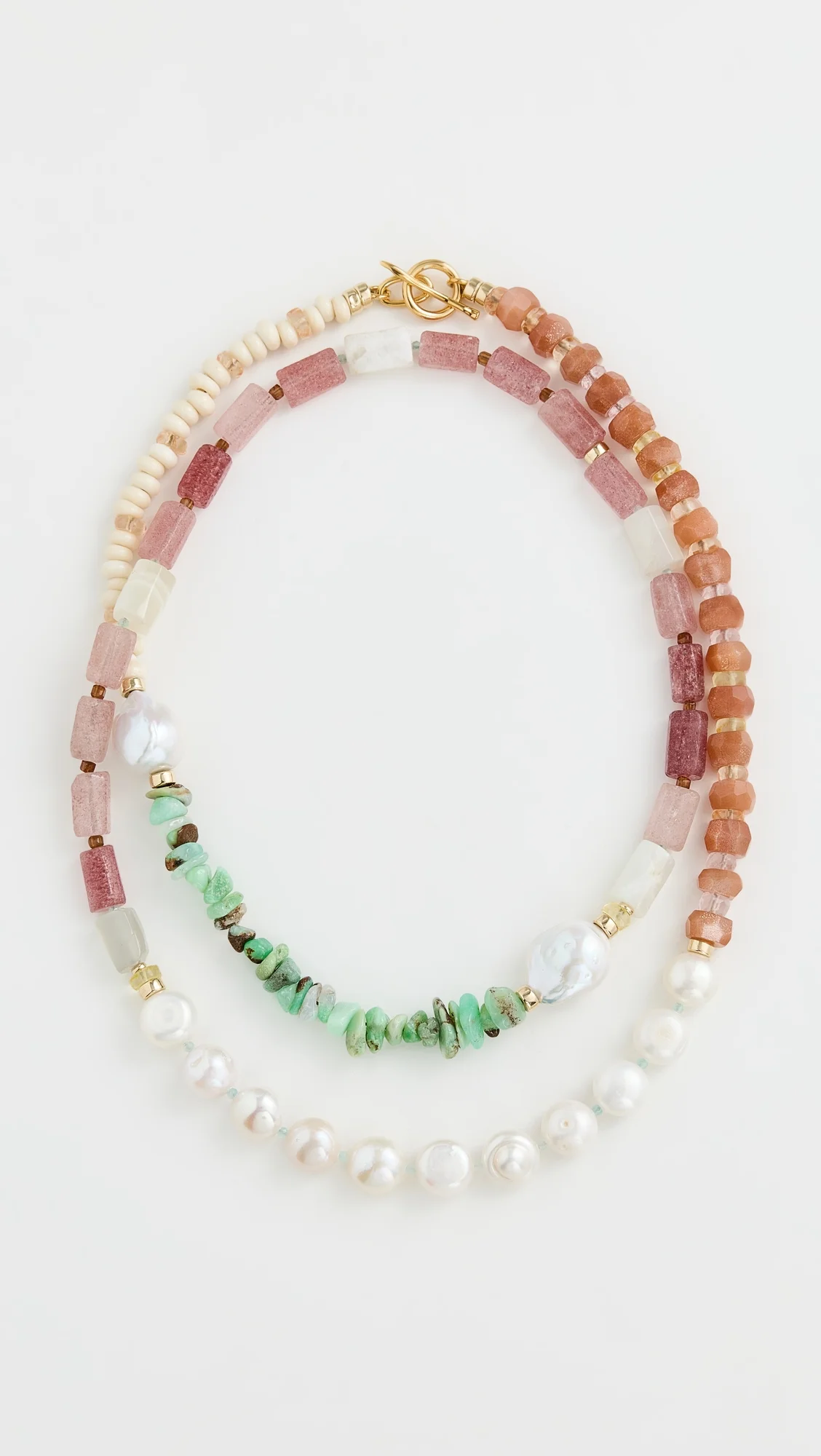 - Can be worn long or doubled - Faceted crystal accents - Freshwater cultured pearls - Rectangular copper sunstone - Rectangular quartz - Triangle chrysoprase - Round amazonite - Rectangular moonstone - Gold plated brass - Ring and toggle closure - Made in the USA Style #LIZIE41183 Size & Fit Length: 32.75in / 83.0cm