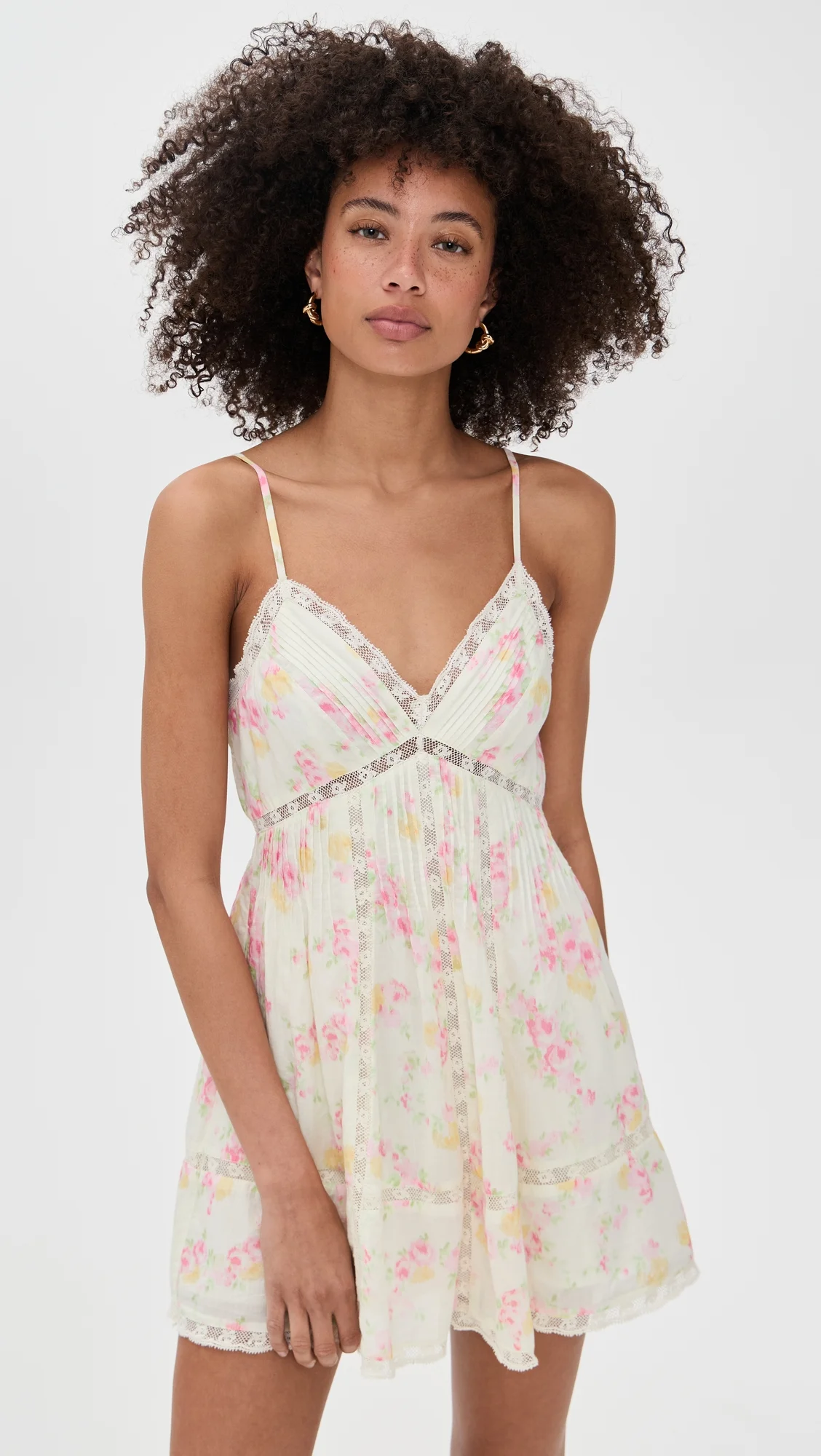- Fabric: Lightweight, non-stretch weave - Lace details and floral print - Pintuck detailing - Mini length - V neck - Adjustable shoulder straps - Pullover design, no closure - On-seam side pockets - Shell: 100% cotton - Lined - Hand wash - Imported, India Style #LSHAC31532