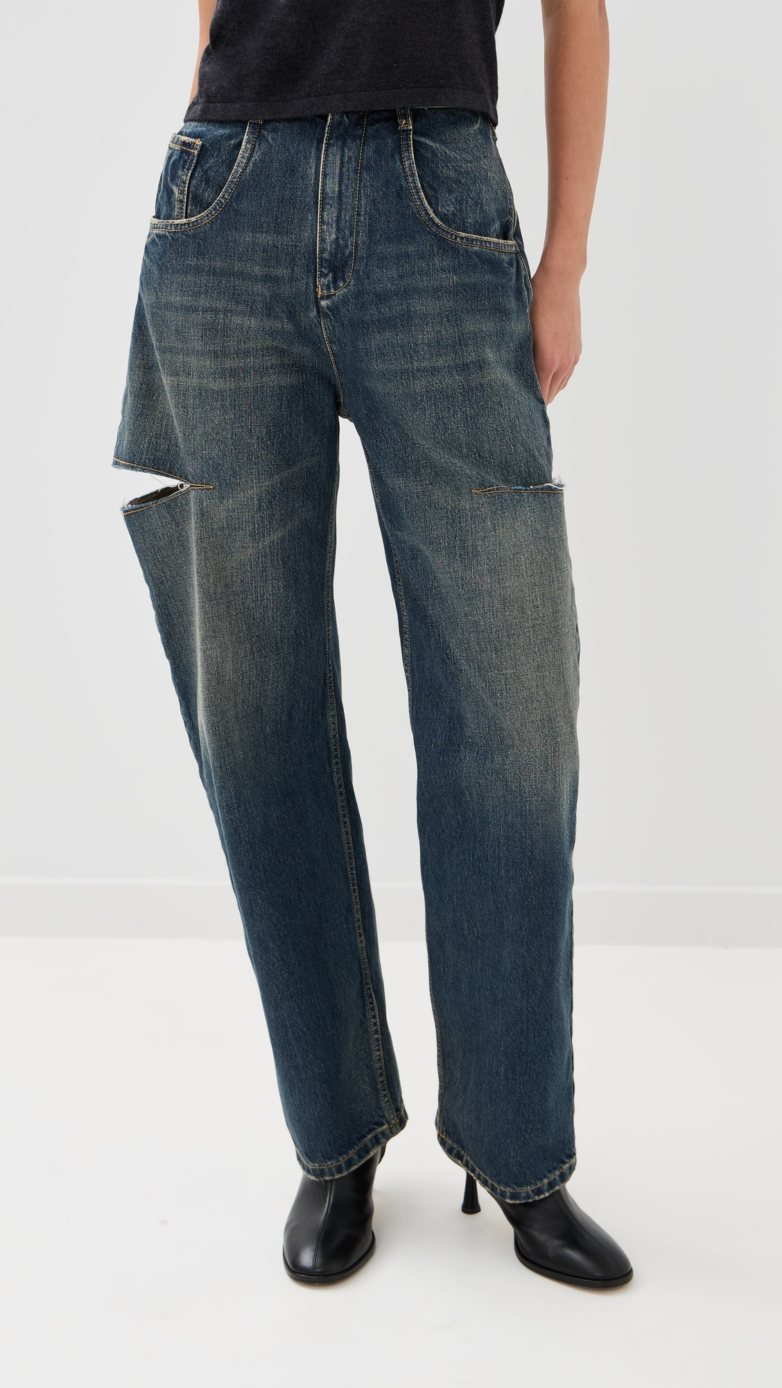 - Fabric: Mid-weight, non-stretch denim - Fading and whiskering - Distressed detailing - Cutout at sides with frayed edges - Button closure and zip fly - 5-pocket styling - Shell: 100% cotton - Wash cold - Made in Italy Style #MARGI41184