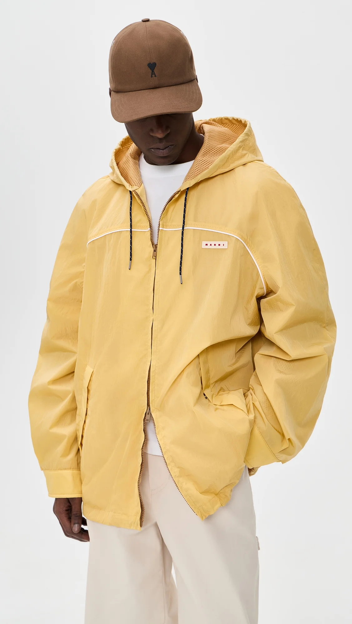 - Fabric: Lightweight, non-stretch technical weave - Drawcord at hem - Logo patch at chest - Hooded neckline - Long sleeves with snap cuffs - Two-way zip closure - Patch front pockets - Shell: 100% polyamide - Lined - Lining: 100% polyester - Wash cold - Made in Italy Style #MARNI30766 Size & Fit Model measurements: Size 50: Khorey (5'11") usually wears size 48 Measurements from size 50 Length: 29.5in / 75cm Sleeve: 33.75in / 86cm Chest: 50.5in / 128cm