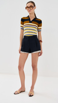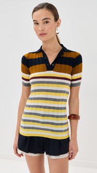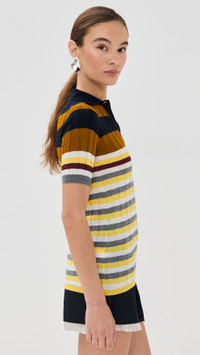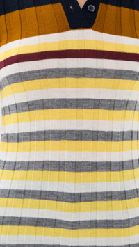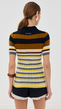 - Fabric: Lightweight ribbed knit - Stripe pattern - Collared neck - Elbow-length sleeves - Partial button placket - Shell: 100% virgin wool - Dry clean - Imported, Romania Style #MARDB31401