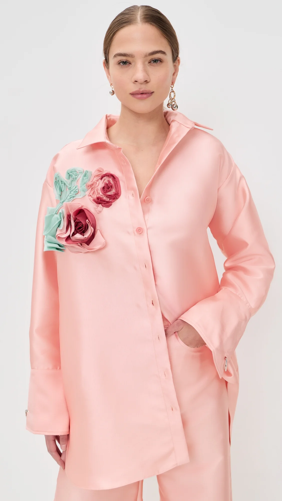 Heavy Satin Flower Embellished Oversized Shirt