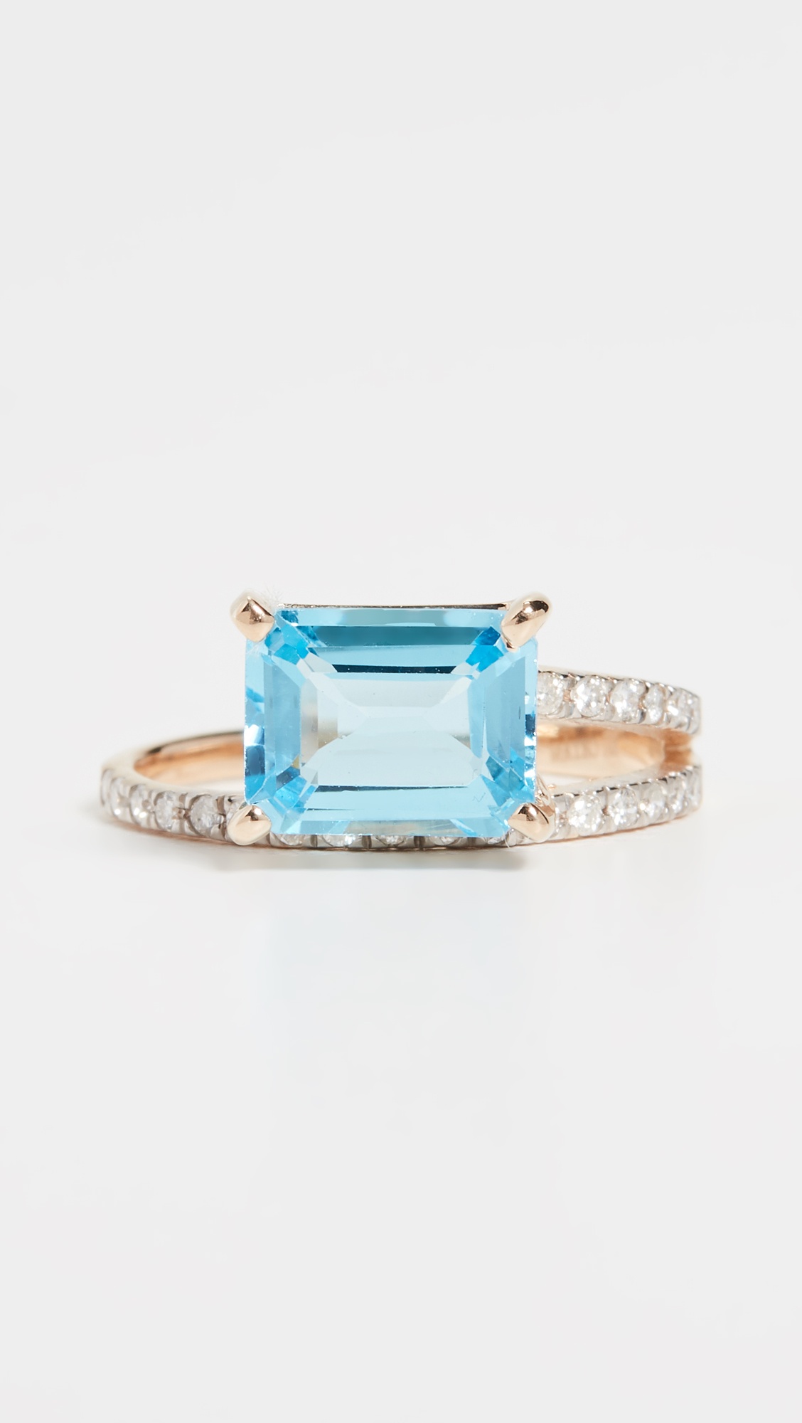 - Asymmetrical band - Round diamond - Square blue topaz - Square topaz - 14k gold - Made in the USA Style #MATEO30039