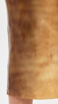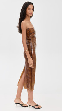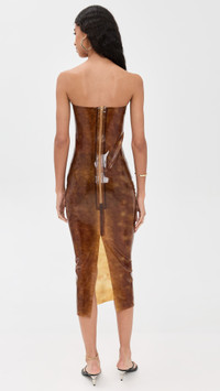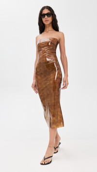 - Fabric: Lightweight latex weave with stretch - Slit at back hem - Midi length - Strapless - Sleeveless - Zip at back - Sheer - Shell: 100% rubber - Hand wash - Made in the USA Style #MIAOU30171 Size & Fit Please note: this dress will arrive with a matte powder finish that prevents the latex from sticking to itself. To make the dress as shiny as it is in product imagery, add latex-friendly lube. Model measurements: Size S: Rocio (5'11") usually wears size XS Measurements from size S Length: 40.25in / 102.0cm, from center back