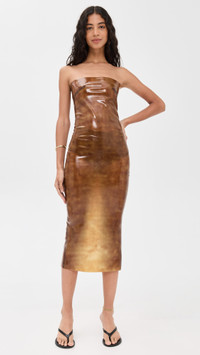 - Fabric: Lightweight latex weave with stretch - Slit at back hem - Midi length - Strapless - Sleeveless - Zip at back - Sheer - Shell: 100% rubber - Hand wash - Made in the USA Style #MIAOU30171