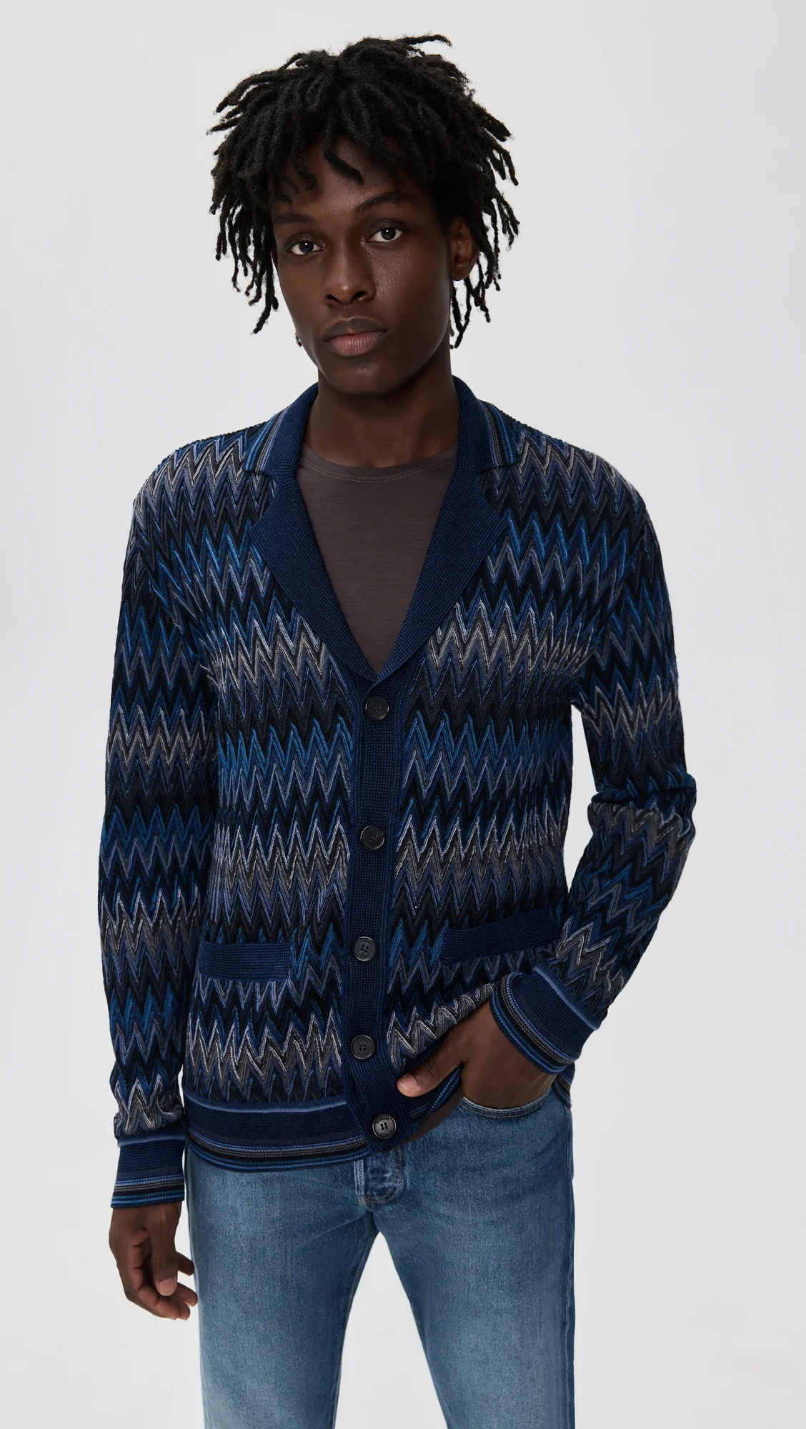- Fabric: Mid-weight textured knit - Zigzag pattern - V neck - Long sleeves - Button placket - Patch front pockets - Shell: 100% wool - Hand wash - Made in Italy Style #MISON40929