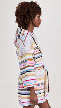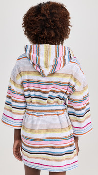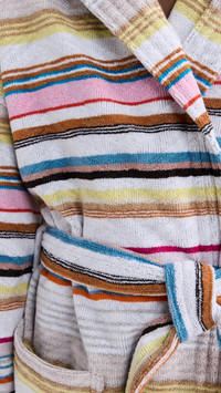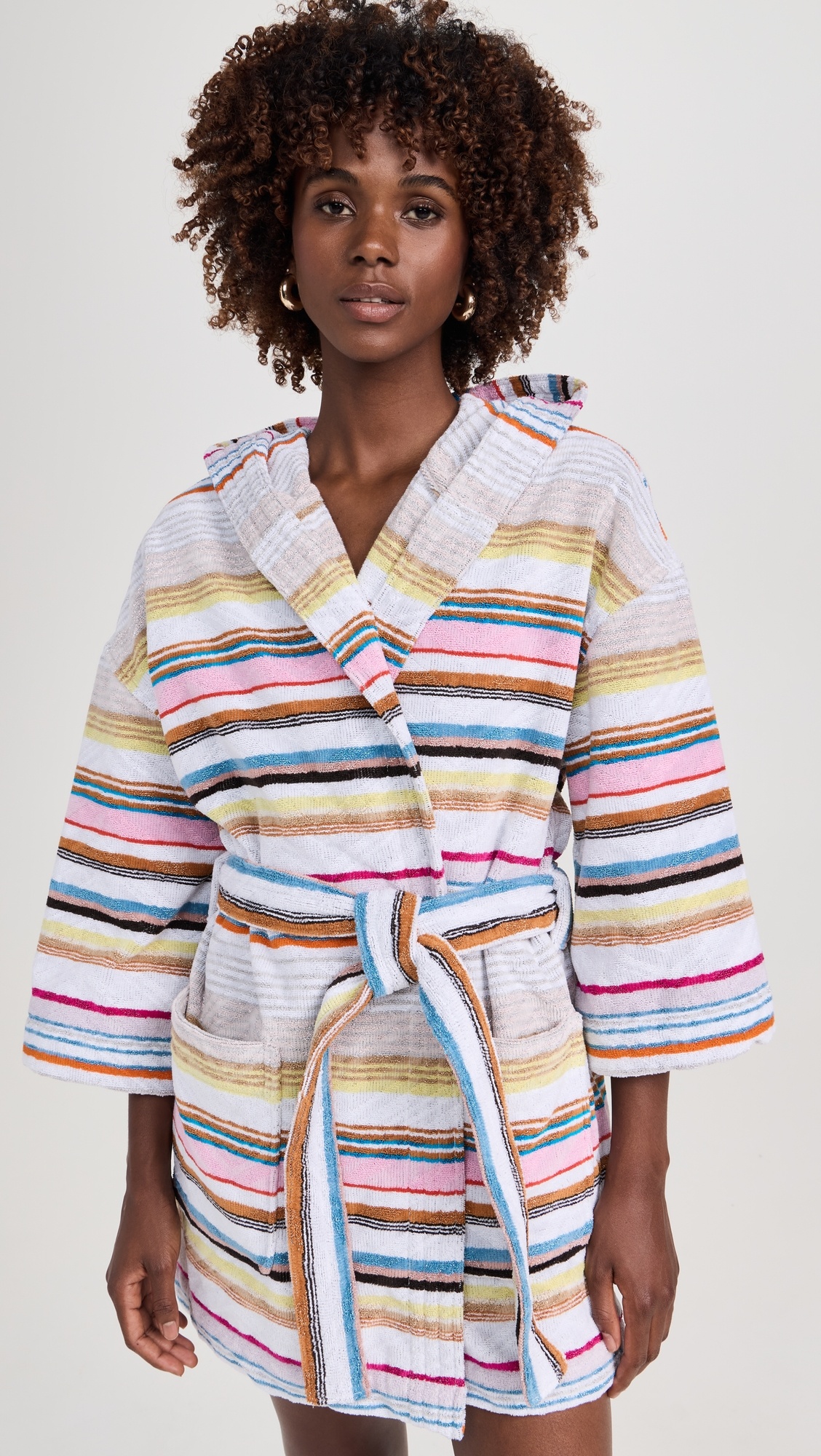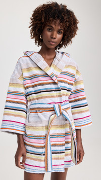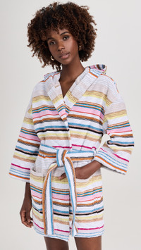 - Fabric: Heavyweight terry cloth - Stripe pattern with glitter metallic threading - Hooded design with long sleeves - Open placket with self-tie belt - Patch front pockets - Shell: 100% cotton - Wash warm - Made in Portugal Style #MHOME30142 Size & Fit Measurements from size S Length: 43.25in / 110.0cm, from shoulder