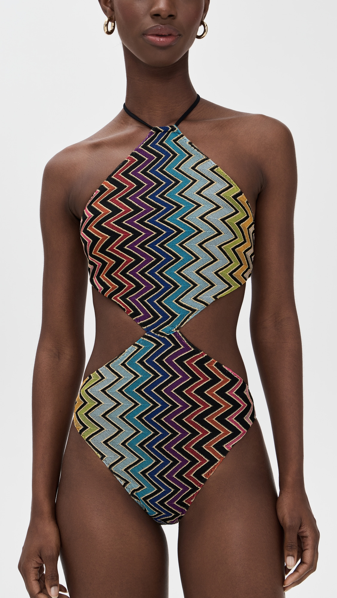 - Zigzag pattern - Moderate coverage - Ties at back - Halter straps - Shell: 60% rayon/25% polyester/15% metallic - Lined - Hand wash - Made in Italy Style #MISON40883