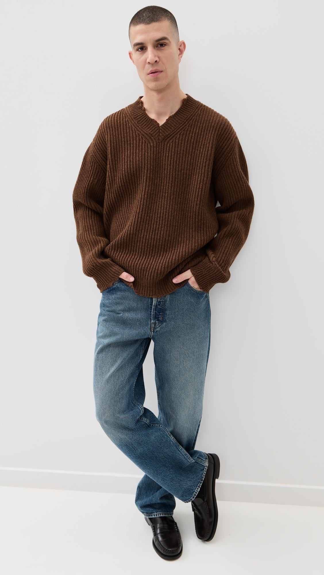 - Fabric: Heavyweight ribbed knit - Lightly distressed - V neck - Long sleeves with dropped shoulders - Shell: 80% wool/20% polyamide - Dry clean - Made in Italy Style #MMSIX30640