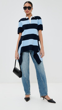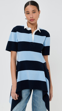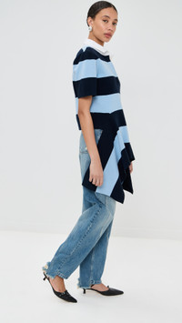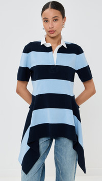 - Fabric: Mid-weight knit - Stripe pattern - Asymmetrical hem - Polo neckline - Short sleeves - Shell: 80% cotton/20% nylon - Dry clean - Imported, China Style #MNSEE30504