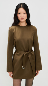 - Fabric: Lightweight, non-stretch satin - Shoulder pads - Mini length - Crew neck - Long sleeves - Hidden zip at back and self-belt at waist - Shell: 100% polyester - Unlined - Dry clean - Imported, Hungary Style #NANUS30555 Size & Fit Model measurements: Size S: Somin (5'10.5") usually wears size XS-S Measurements from size S Length: 33.5in / 85.0cm, from shoulder to front hem