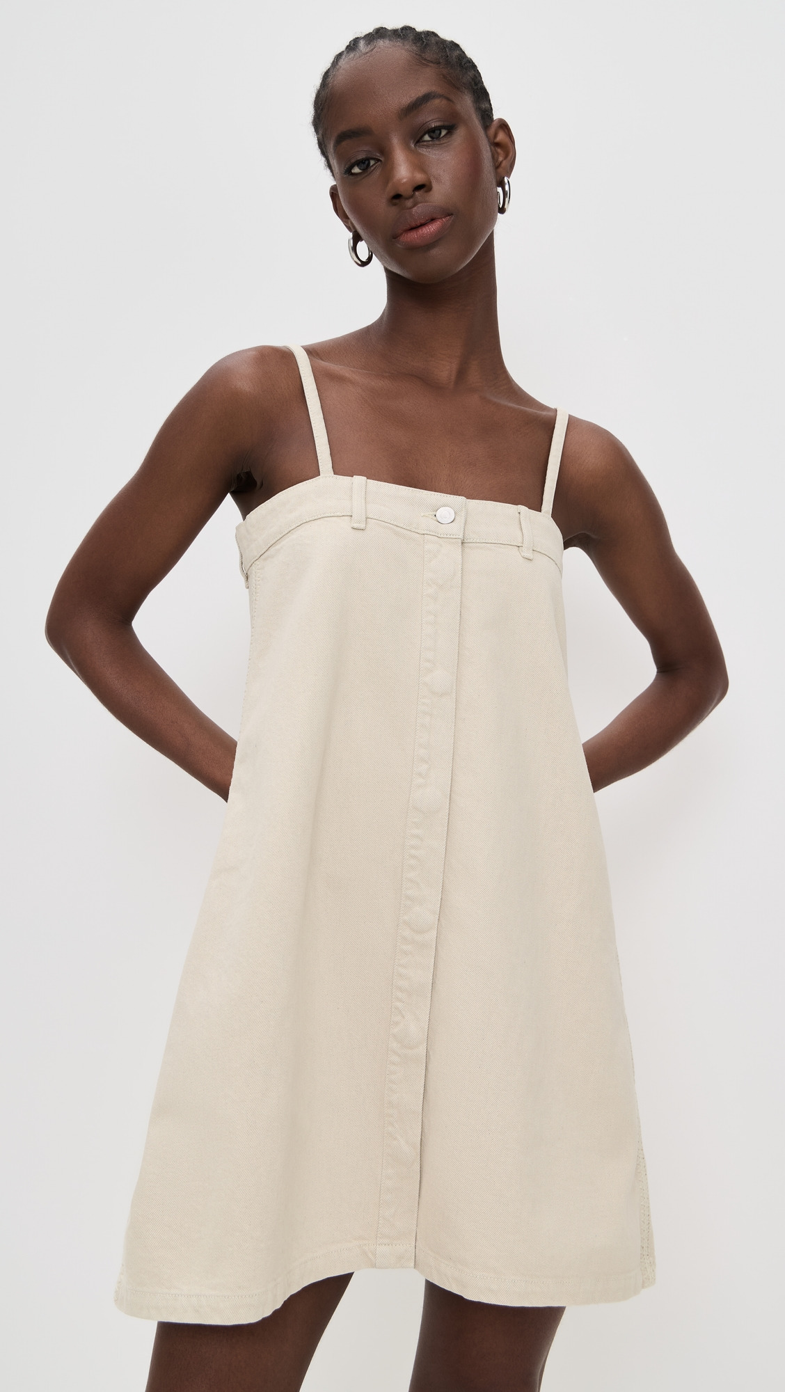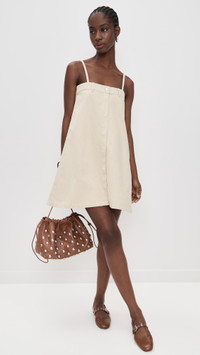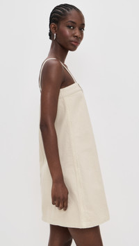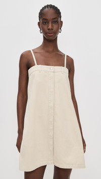 - Fabric: Mid-weight, non-stretch denim - Belt loops and silver-tone hardware at top hem - Tonal stitching at sides - Mini length - Square neckline - Sleeveless - Covered button placket - Shell: 100% cotton - Unlined - Hand wash - Made in Portugal Style #NANUS30539 Size & Fit Model measurements: Size XS: Cher (5'11") usually wears size XS Measurements from size XS Length: 33in / 84.0cm, from shoulder