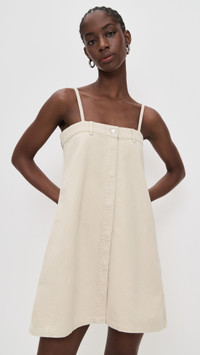 - Fabric: Mid-weight, non-stretch denim - Belt loops and silver-tone hardware at top hem - Tonal stitching at sides - Mini length - Square neckline - Sleeveless - Covered button placket - Shell: 100% cotton - Unlined - Hand wash - Made in Portugal Style #NANUS30539