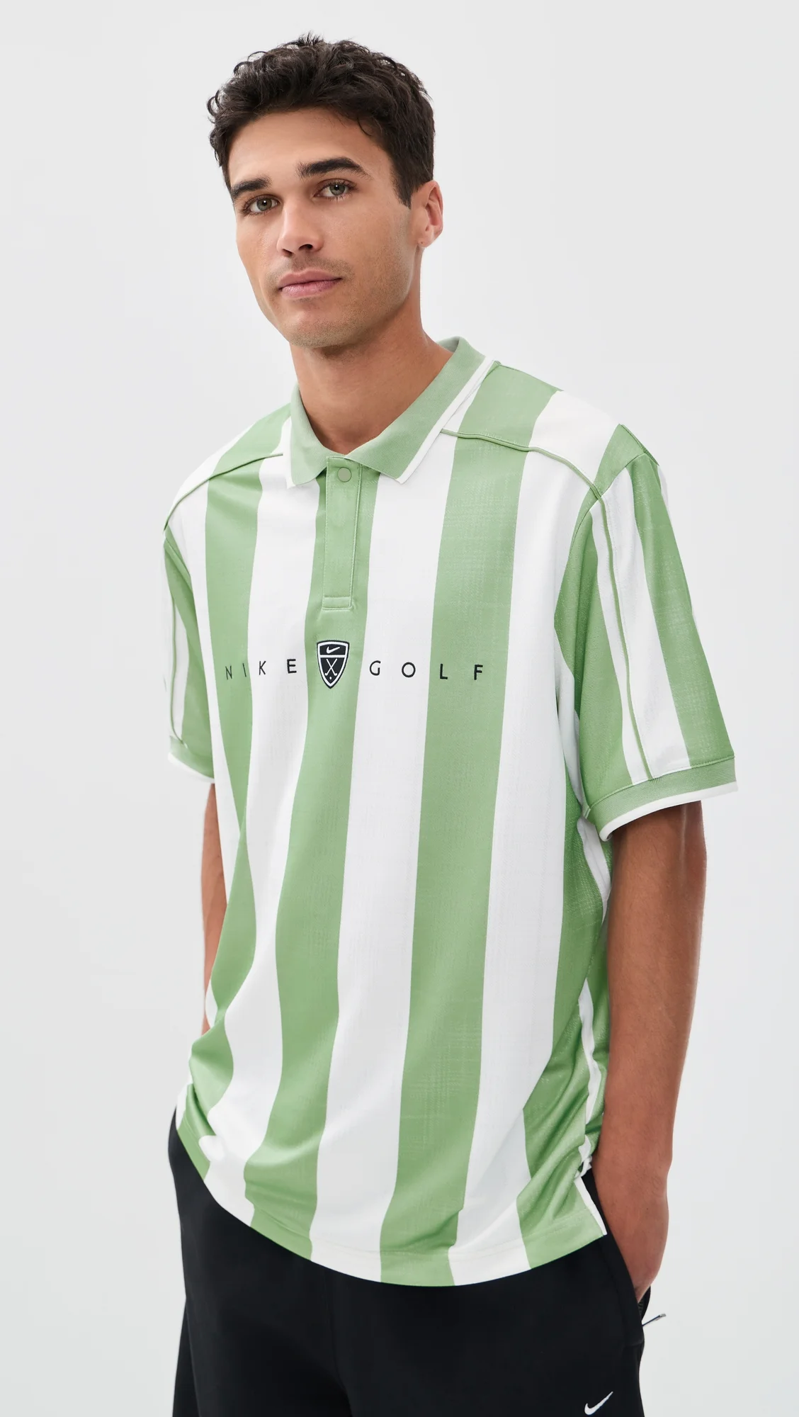 - Fabric: Lightweight stretch jersey - Stripe and subtle shiny tartan pattern - Moisture wicking and quick dry fabric - Polo neckline - Short sleeves - Partial snap placket - Shell: 100% polyester - Wash cold - Imported, Vietnam Style #NIKEE30653 Size & Fit Model measurements: Size M: Laurence (6'2") usually wears size M Measurements from size M Length: 30in / 76cm Chest: 47.25in / 120cm