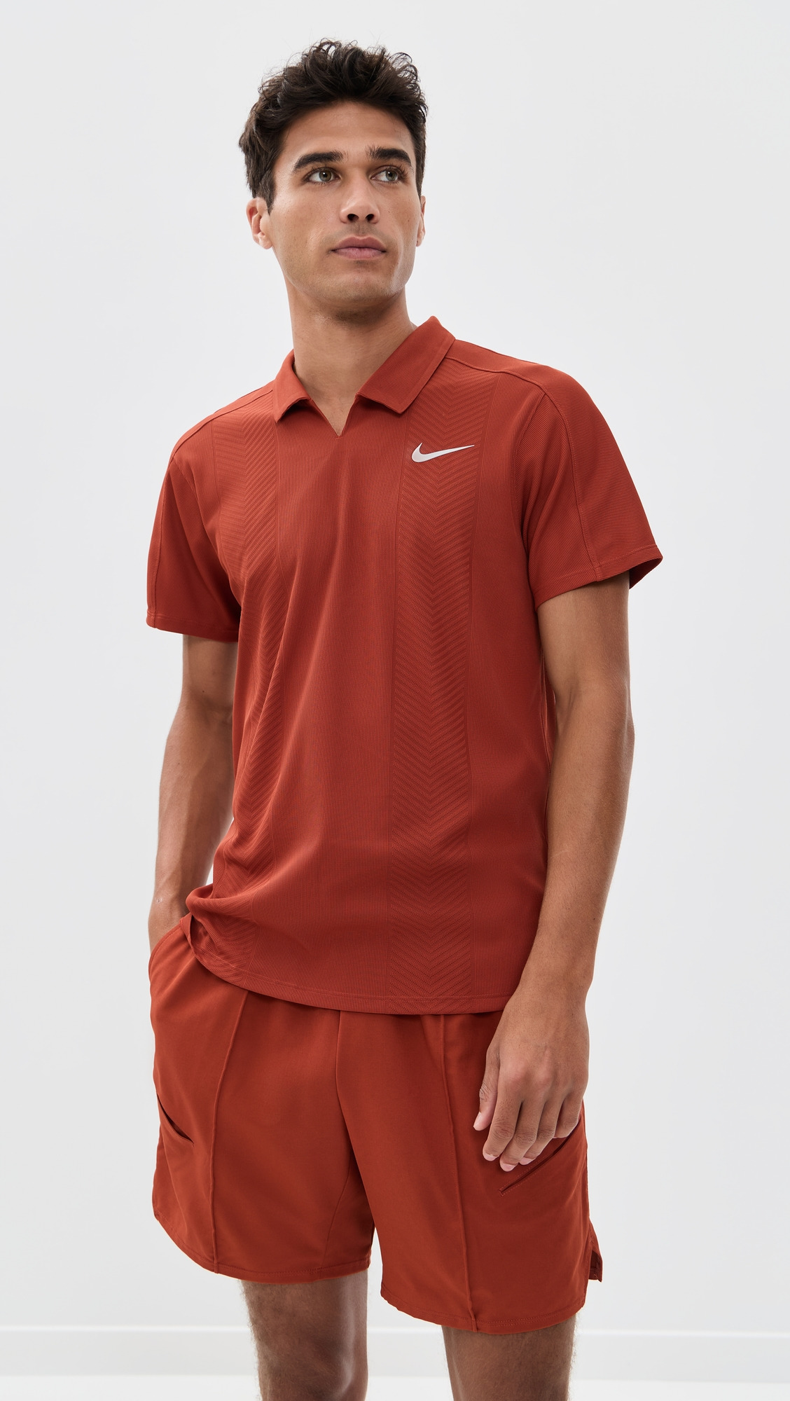 - Fabric: Lightweight activewear jersey with stretch - Metallic logo at chest - Polo neckline - Short sleeves - Pullover design, no closure - Shell: 100% polyester - Wash cold - Imported, Cambodia Style #NIKEE30716 Size & Fit Model measurements: Size M: Laurence (6'2") usually wears size M Measurements from size M Length: 29.25in / 74cm Sleeve: 15.75in / 40cm Chest: 37.75in / 96cm
