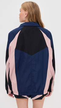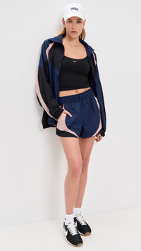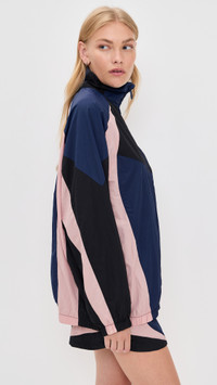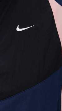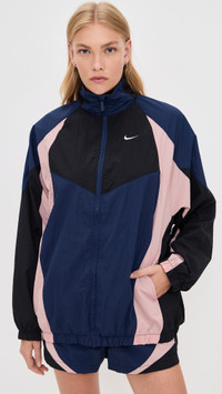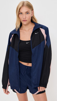- Fabric: Lightweight, non-stretch technical weave - Colorblock design with logo graphic - Elastic waist - Mock neck - Long sleeves - Two-way zip closure - Patch front pockets - Shell: 100% polyester - Mesh lining - Wash cold - Imported, Indonesia Style #NIKEE30248