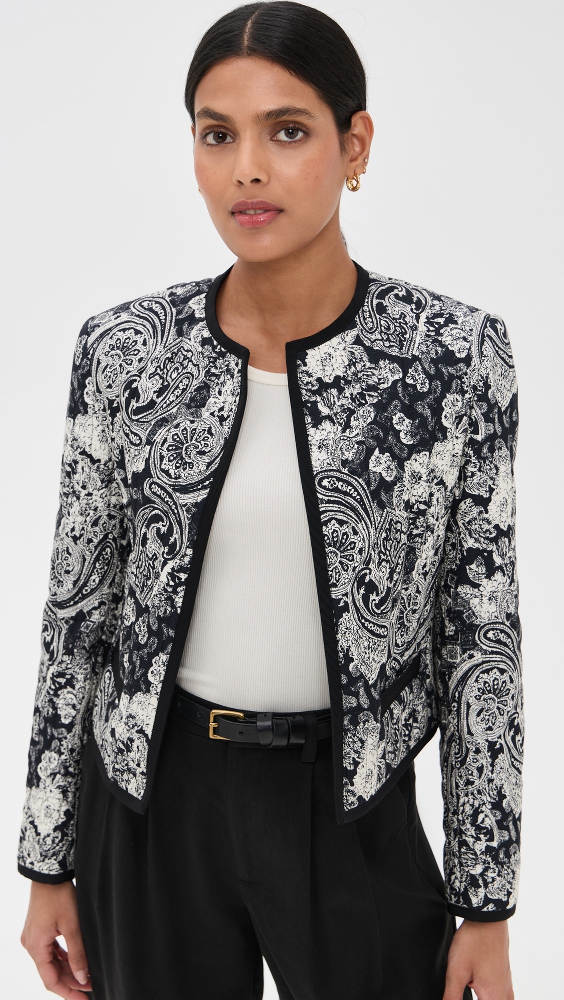 - Fabric: Lightweight, non-stretch quilted weave - Grosgrain trim - Paisley print - Crew neck - Welt front pockets - Shell: 100% viscose - Trim: 50% cotton/50% viscose - Lined - Dry clean - Made in Portugal - Long sleeves Style #NLOTA21628 Size & Fit Model measurements: Size S: Samruddhi (5'8") usually wears size XS-S Measurements from size S Length: 20in / 51.0cm, from shoulder