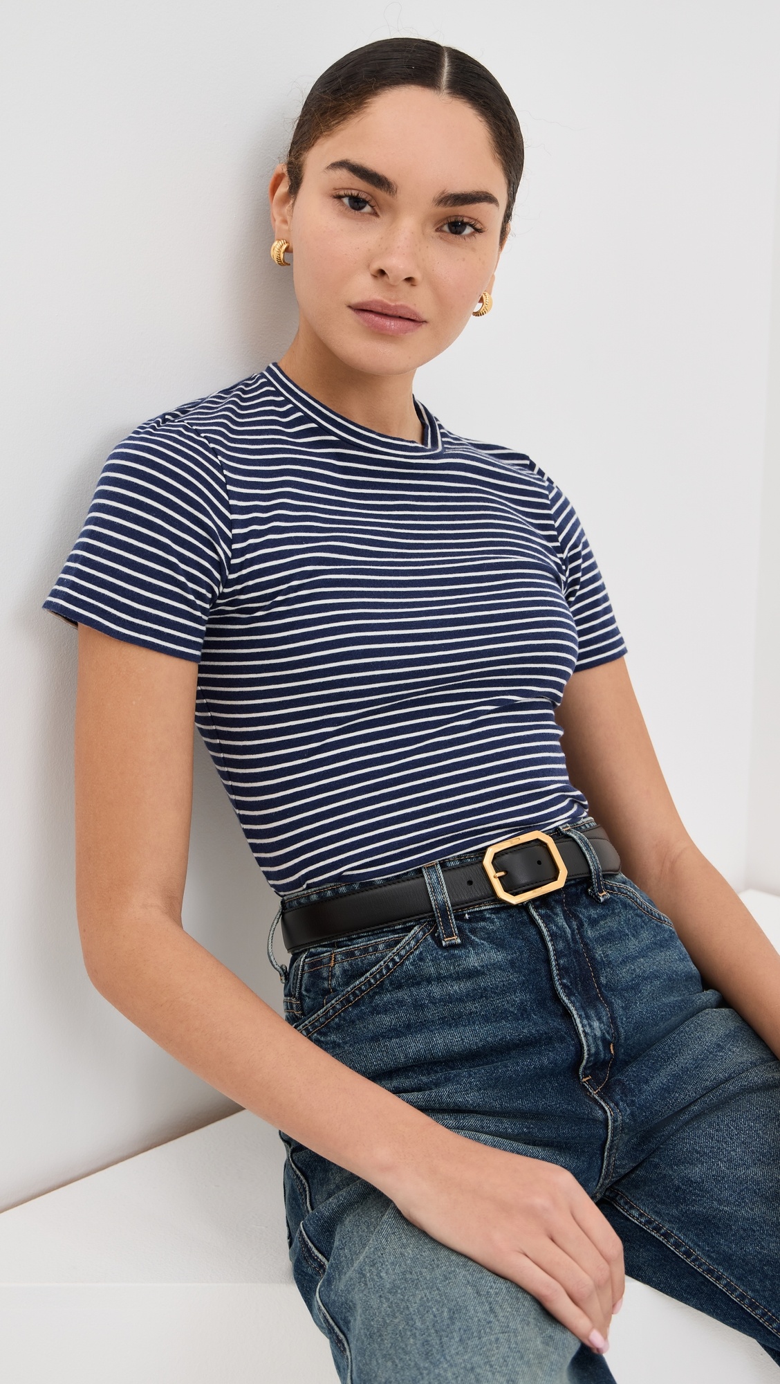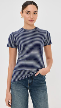 - Fabric: Lightweight jersey - Stripe print - Crew neck - Short sleeves - Shell: 100% cotton - Wash cold - Made in the USA Style #NLOTA21609