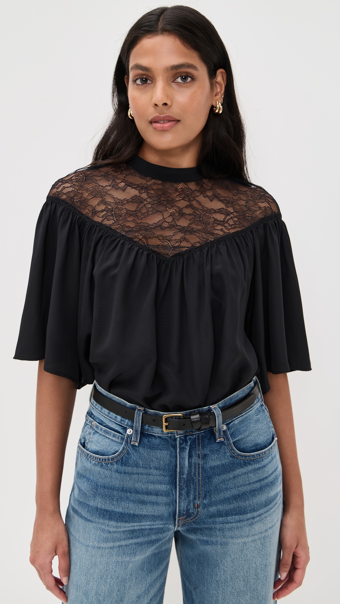 - Fabric: Lightweight, non-stretch silk crepe - Lace yoke - Crew neck - Elbow-length sleeves - Button keyhole at back - Shell: 100% silk - Dry clean - Made in the USA of imported materials Style #NLOTA21622
