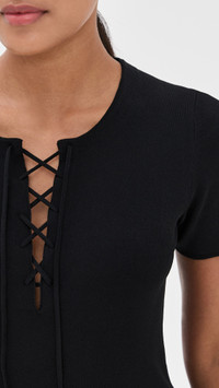 - Fabric: Lightweight stretch knit - Mini length - V neck - Short sleeves - Lace-up at front - Shell: 75% viscose/25% nylon - Unlined - Dry clean - Imported, China Style #NLOTA21621