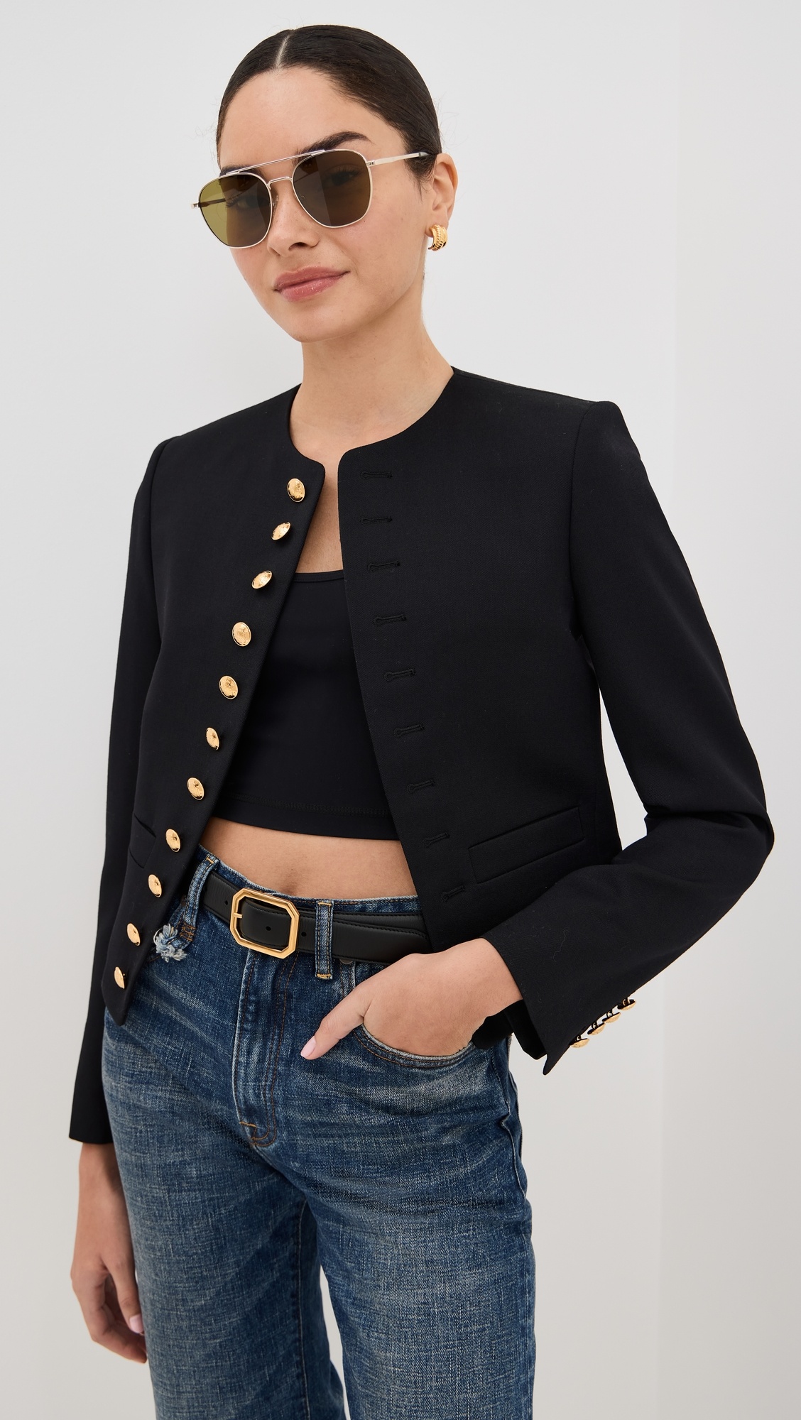 - Fabric: Mid-weight, non-stretch gabardine - Padded shoulders - Crew neck - Long sleeves with button placket - Open placket with decorative gold-tone buttons - Faux welt back pockets - Shell: 100% virgin wool - Lined - Lining: 100% viscose - Dry clean - Made in Portugal Style #NLOTA21590