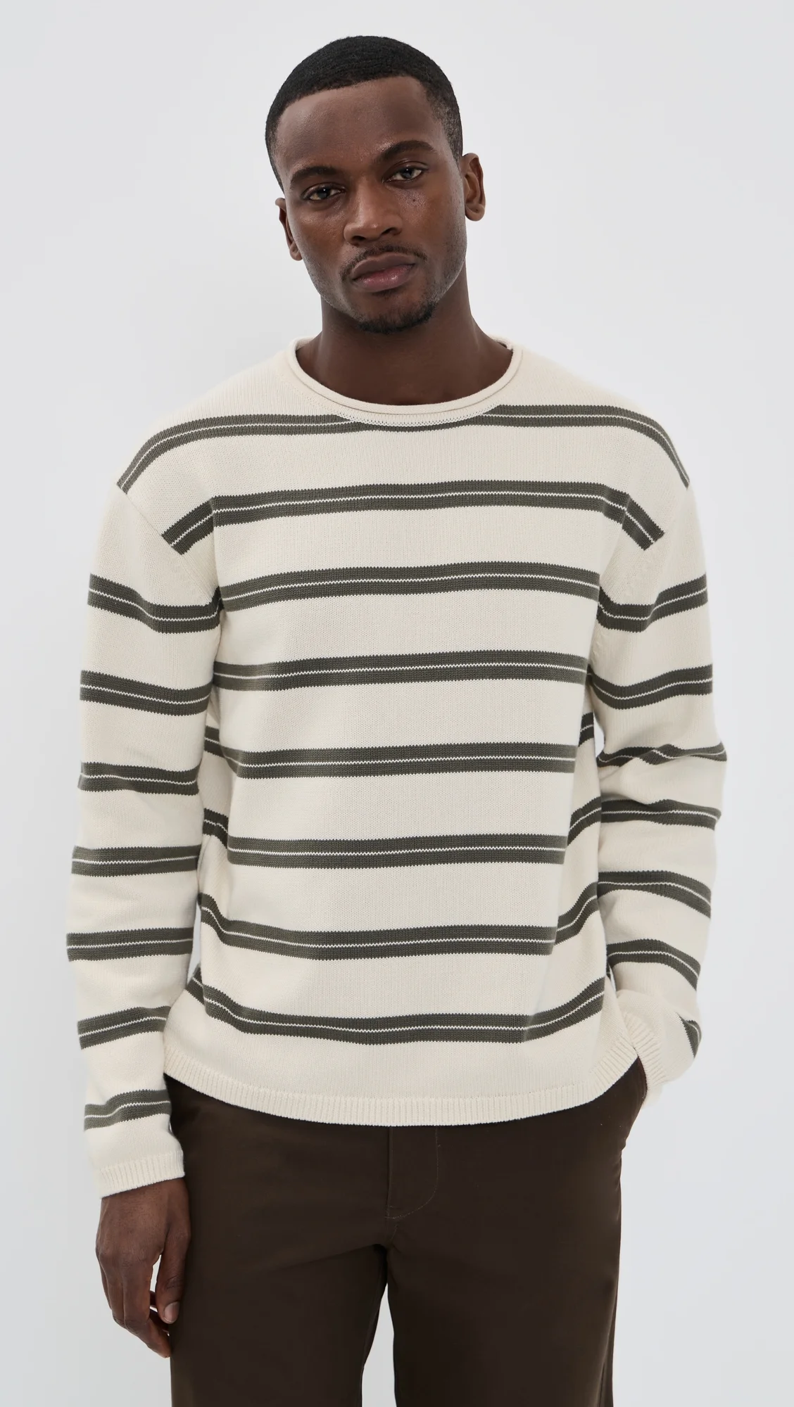 - Fabric: Mid-weight stretch knit - Ribbed edges - Striped pattern - Crew neck - Long sleeves - Shell: 100% cotton - Hand wash - Imported, China Style #NNSEV30266 Size & Fit Model measurements: Size M: Idriss (6'1") usually wears size M-L Measurements from size M Length: 25.5in / 65cm Sleeve: 32.75in / 83cm Chest: 22.5in / 57cm