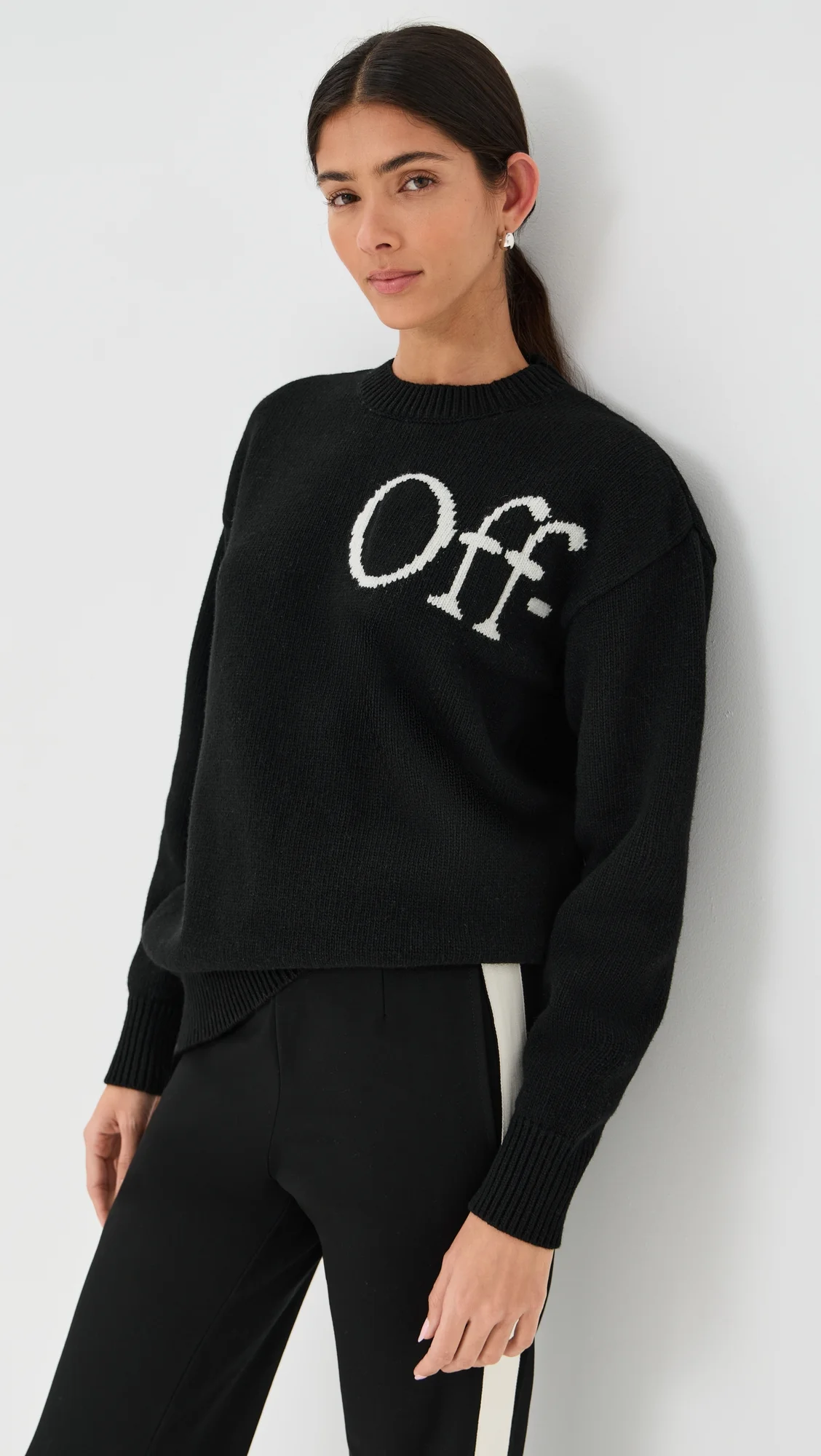 - Fabric: Mid-weight stretch knit - Contrast logo intarsia - Crew neck - Long sleeves with dropped shoulders - Shell: 80% wool/20% polyamide - Dry clean - Made in Italy Style #OFFWH30452