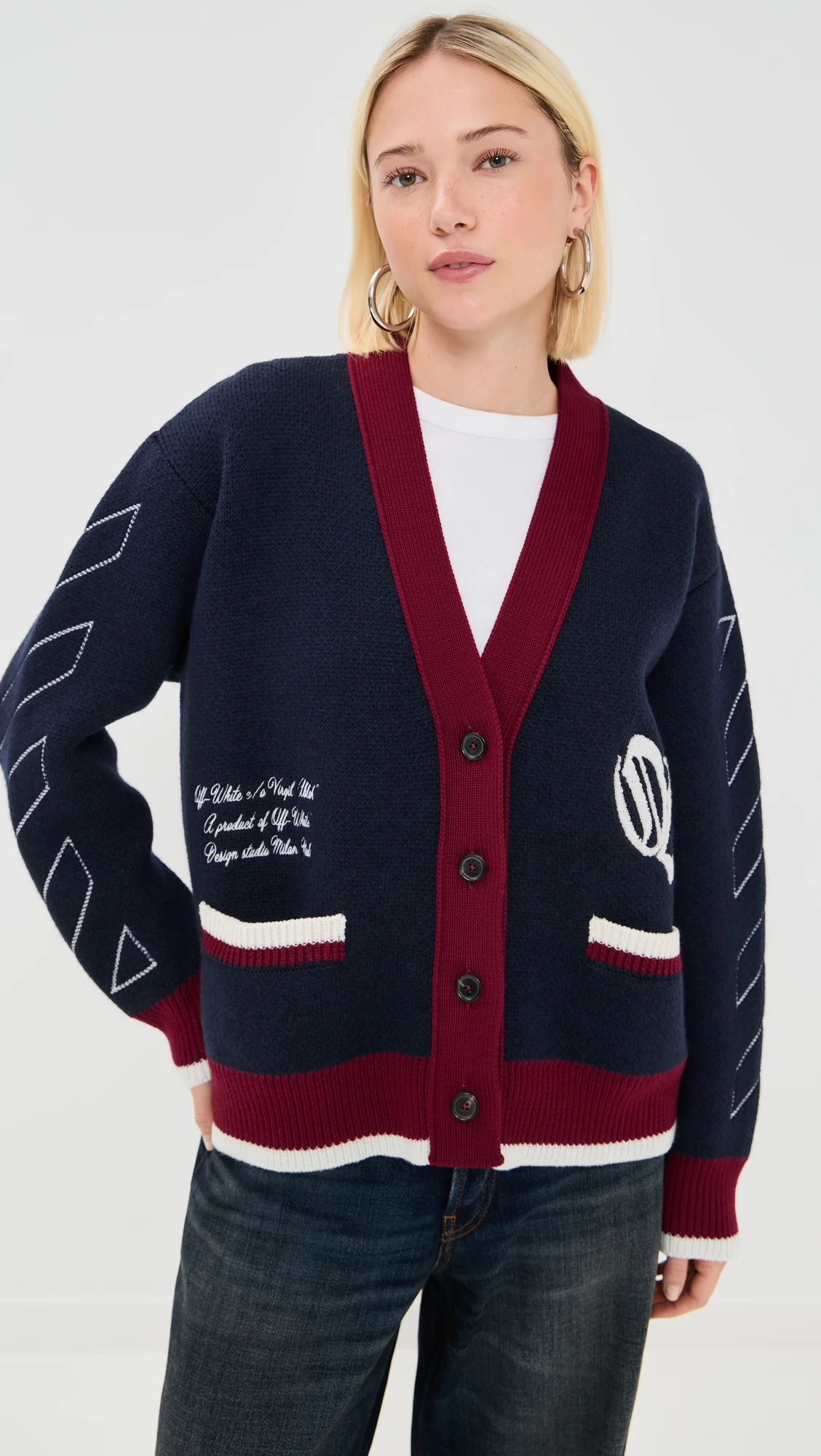 - Fabric: Heavyweight jacquard knit with stretch - Logo embroidery at front and back - Contrast ribbed trim - V neck - Long sleeves - Button placket - Patch front pockets - Shell: 100% wool - Dry clean - Made in Italy Style #OFFWH30468
