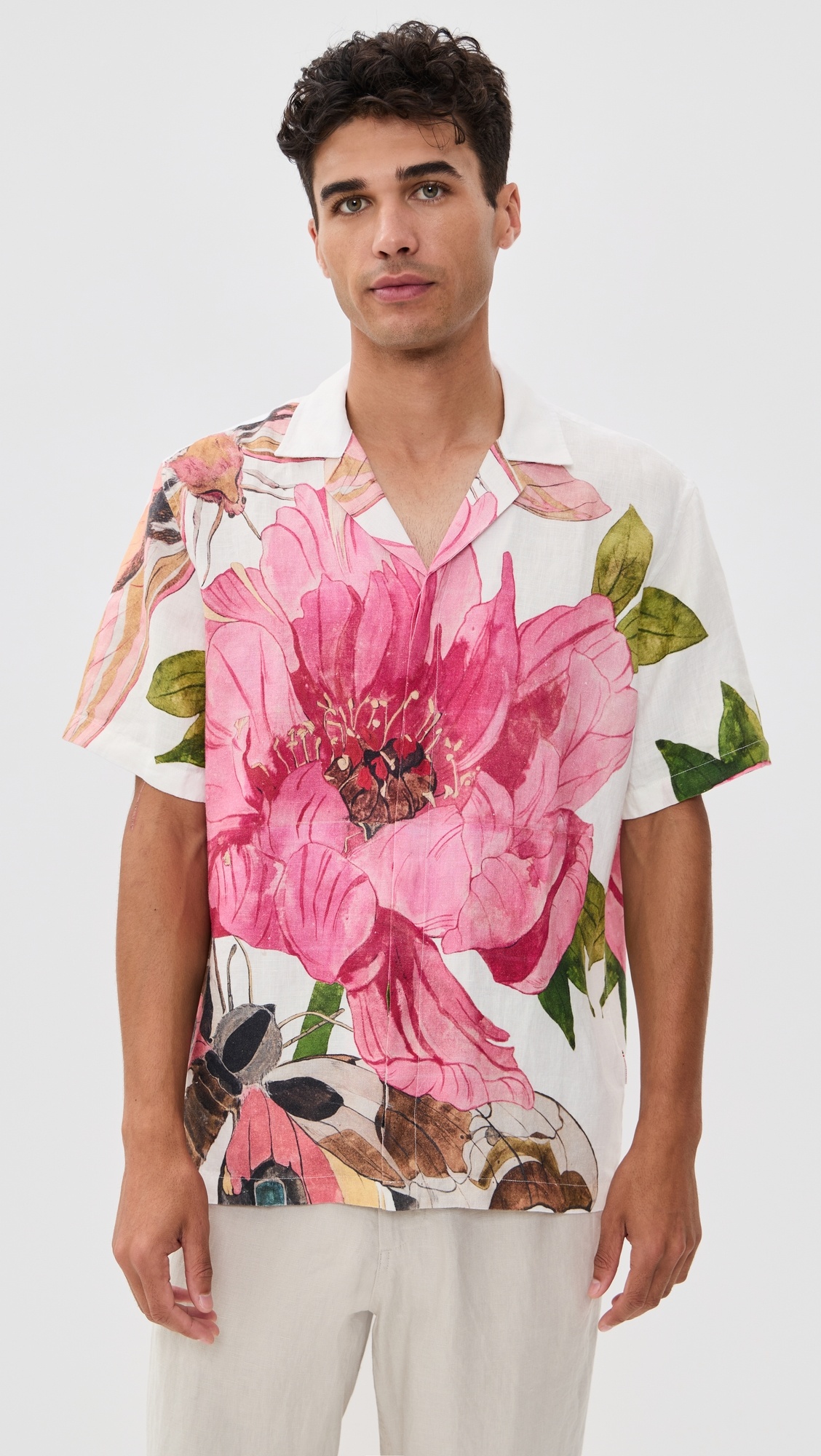 - Fabric: Lightweight, non-stretch linen weave - Floral print - Pleated back yoke - Camp collar - Short sleeves - Covered button placket - Shell: 100% linen - Dry clean - Made in Portugal Style #ORLEB30063 Size & Fit Model measurements: Size M: Laurence (6'2") usually wears size M Measurements from size M Length: 29.25in / 74cm Chest: 45in / 114cm