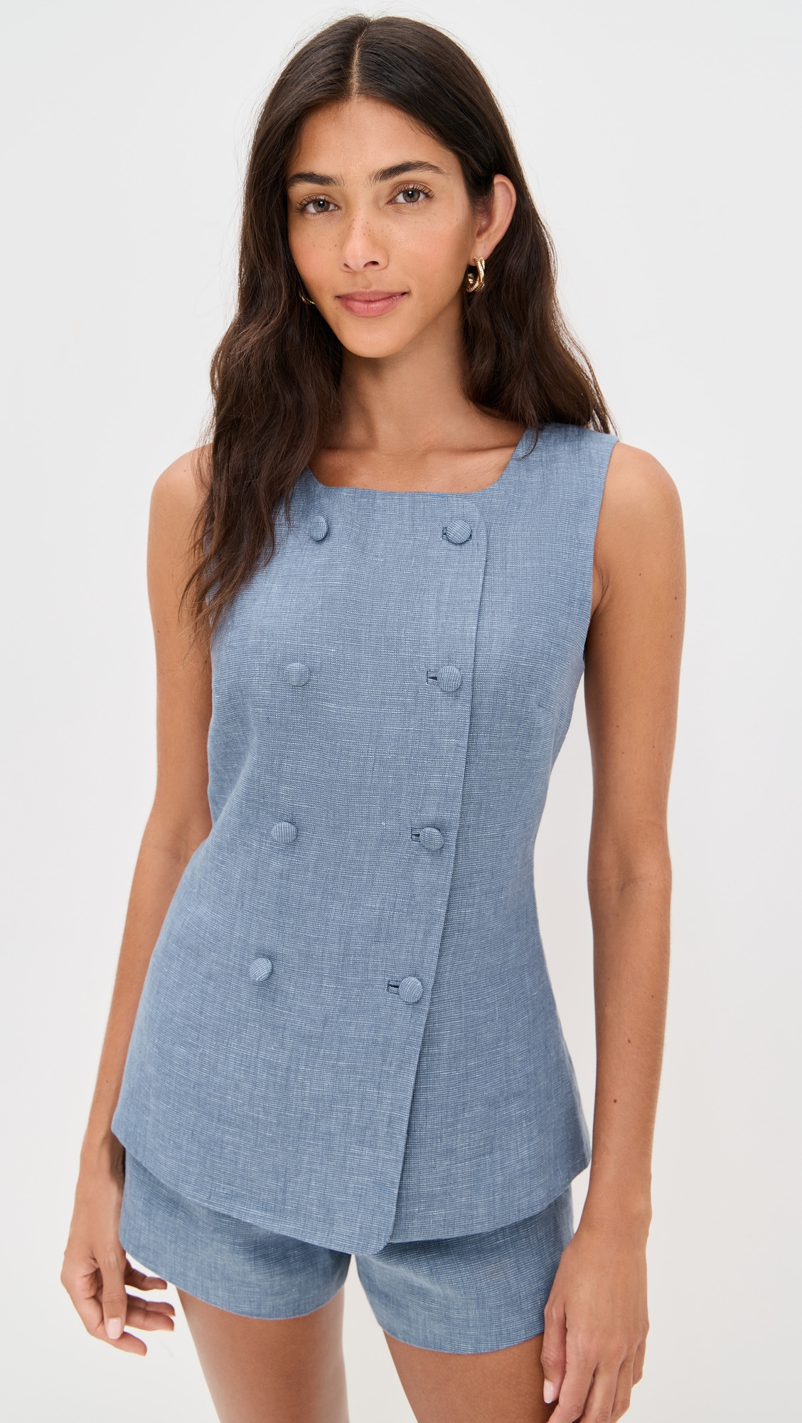 - Fabric: Lightweight, non-stretch slubbed weave - Square neckline - Sleeveless - Double-breasted button placket - Shell: 100% linen - Lined - Lining: 100% cotton - Dry clean - Imported, China Style #POSSE30144